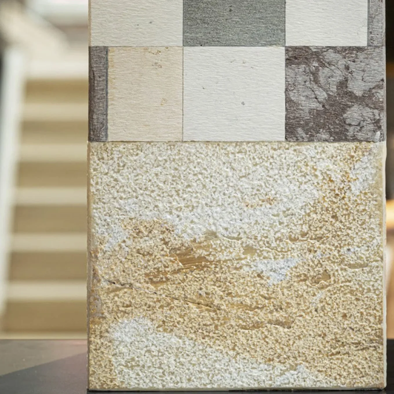 The Square B Vase showcases an elegant design crafted from a harmonious blend of natural marbles and stones, designed by Luciano Setten. This medium-sized vase is thoughtfully constructed in the shape of a parallelepiped, enhancing any home décor with its modern aesthetic. The piece features a striking combination of materials, including a base and cover made from Giallo Siena with a bush-hammered finish, seamlessly integrated with Nero Marquinia, Pietra Serena, Castellavazzo, and Bianco Asiago marbles. The systematic design ensures a cohesive appearance, and the application of epoxy resin affixes the marble to a robust metal or PMMA core, creating the illusion of a unified block. The square lid secures the contents while adding to the overall sculptural quality of the vase. Due to the natural characteristics of the marbles and stones, slight variations in color and pattern may occur, ensuring that each piece is one-of-a-kind.