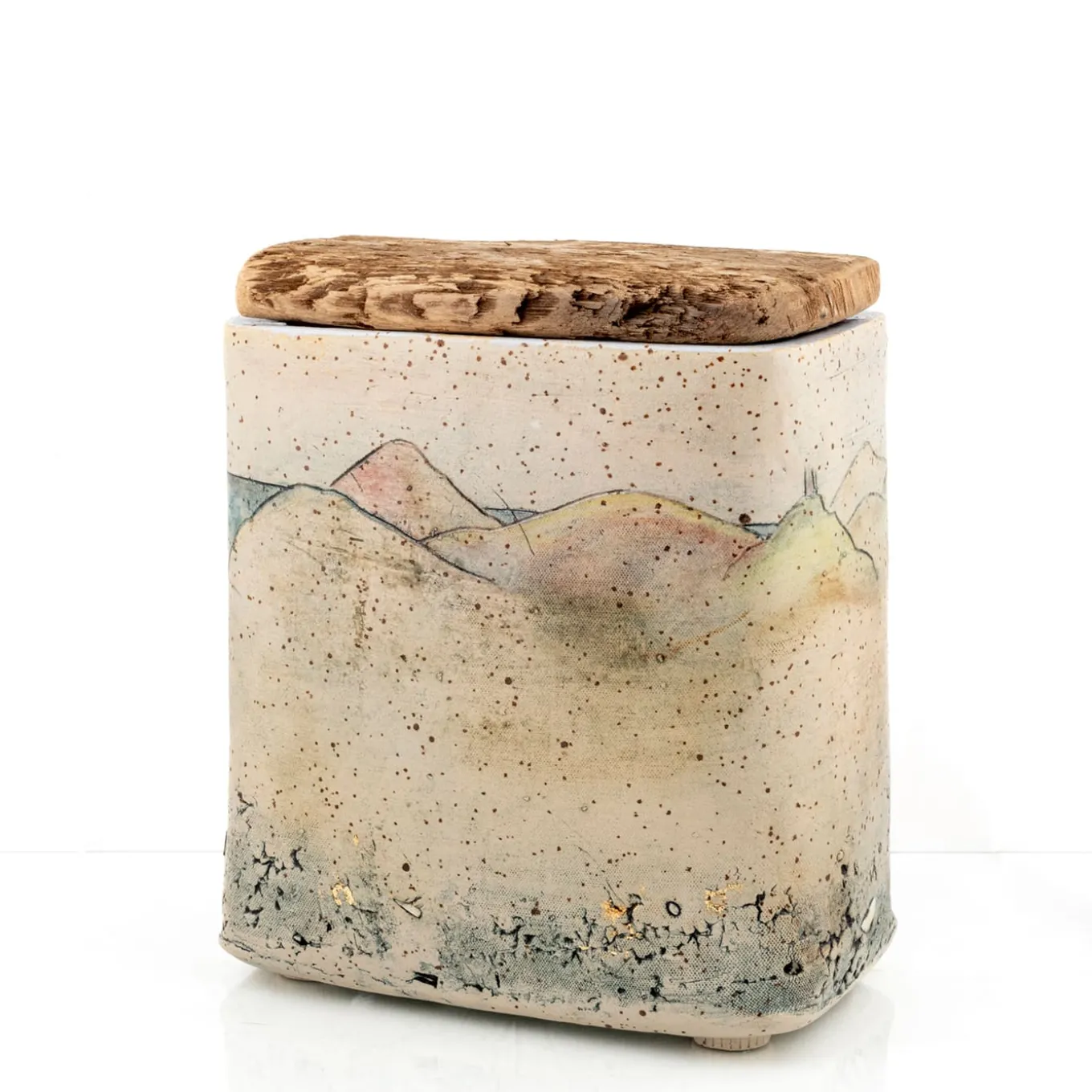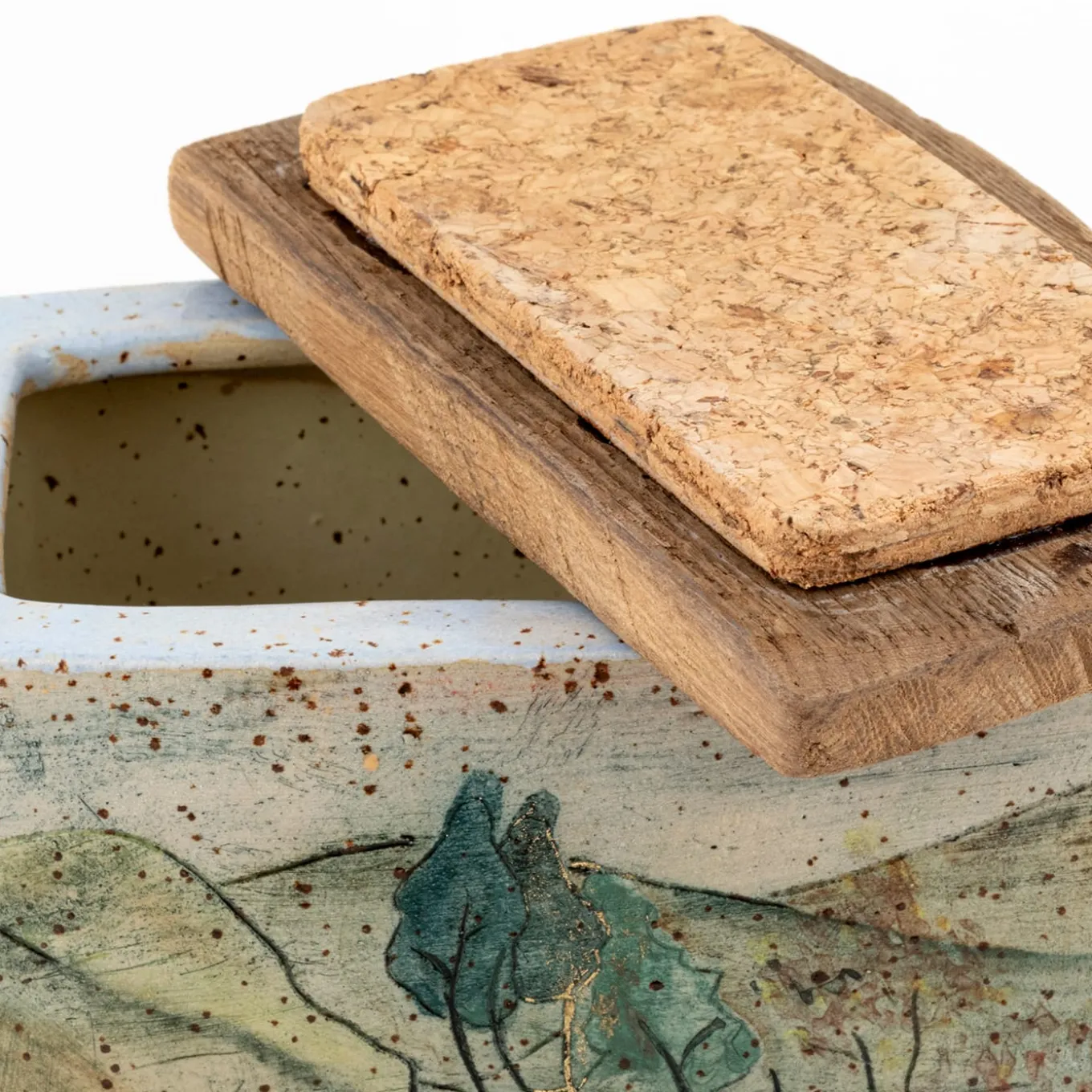 Refined and evocative, this precious handmade vase combines the freshness of a squarish silhouette with the poetry of a painted landscape. Topped with a deliberately uneven flat wooden lid, the stoneware body sports a warm beige-toned glaze on the inside and a transparent one on the outside, where specks dot a romantic landscape with a staircase leading to tranquil hills. It is decorated with engobes and ceramic stains on its four sides.