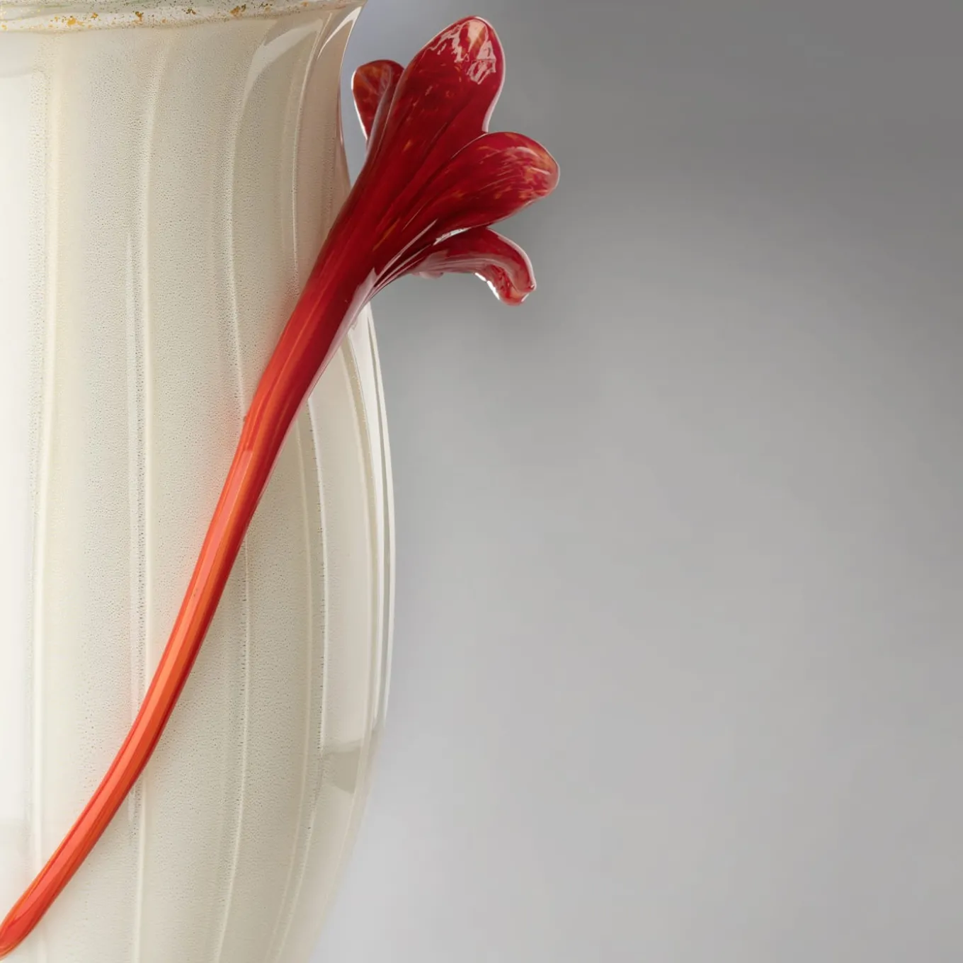 This delightful vase minutely mouth-blown from white Murano glass is distinguished by an artful goblet shape reinvented with a romantic twist given by the graceful red flowers embracing its body. Exquisitely adorned with gentle grooves, its silhouette also incorporates an ovoid volume, standing right onto the flared base, that englobes a myriad of tiny specks in red and yellow for a dynamic color contrast.