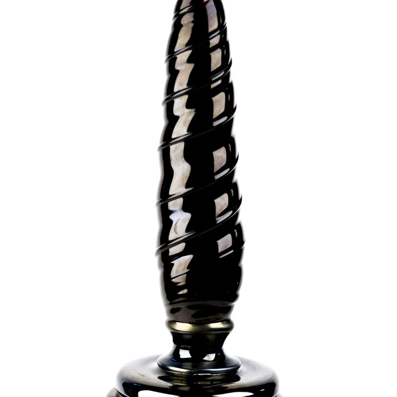 This exquisite bottle in mouth-blown Murano glass flaunts a silhouette that is so detailed and rich in fancy details that soars to the dignity of a true objet d’art. Unrepeatable and precious, it comprises a sinuous body in yellow glass with a twisted, darker filigree incorporated within, completed by a bold plinth base in black glass that matches with the tapered lid showcasing a subtle, twisted texture.