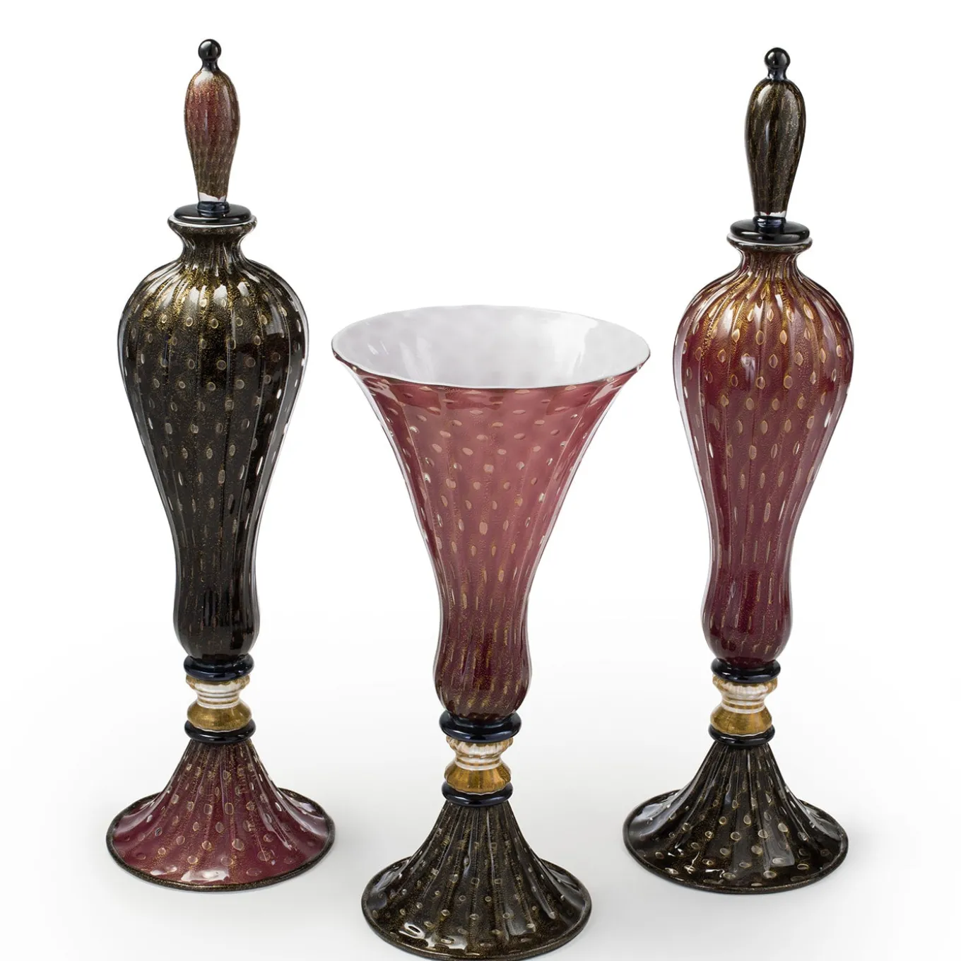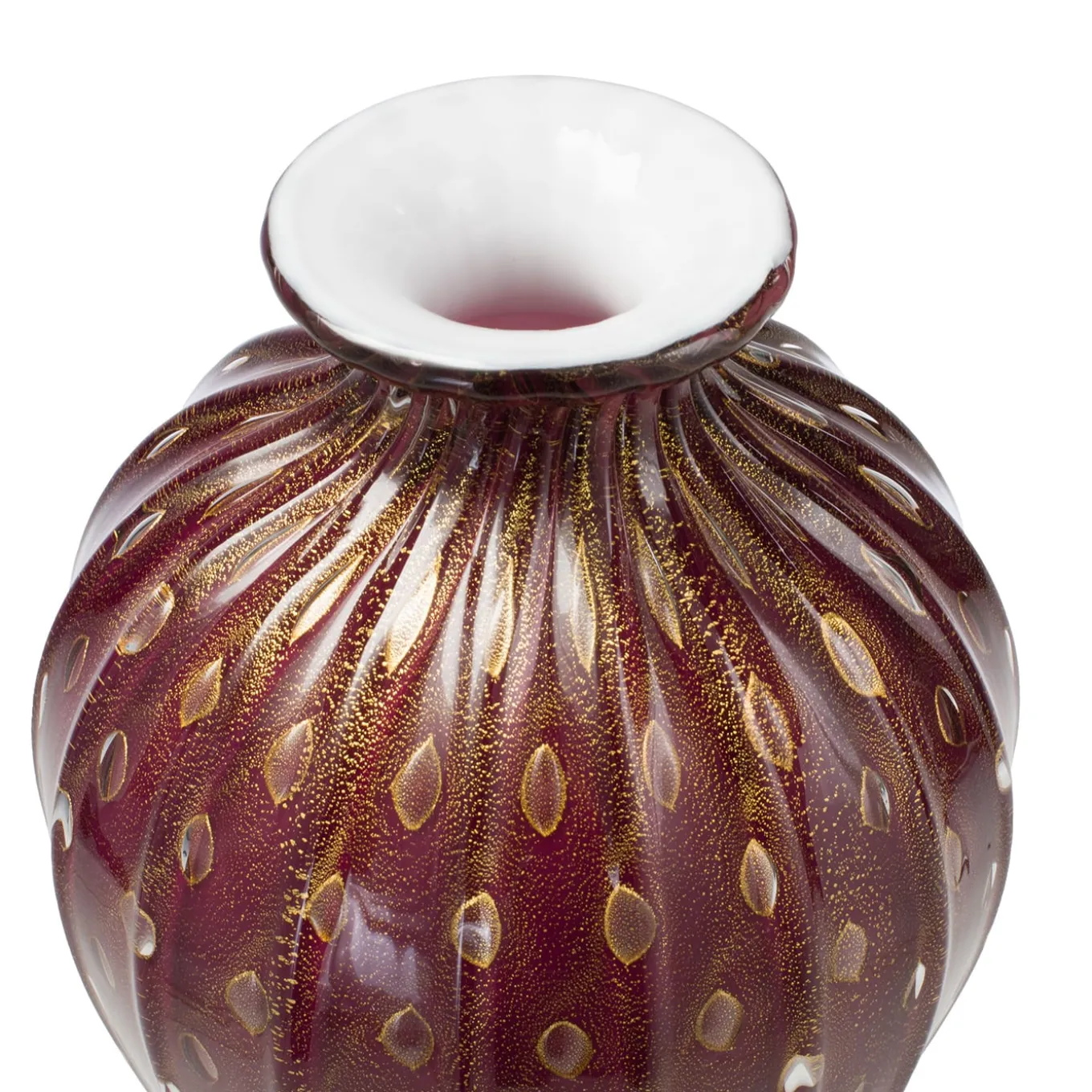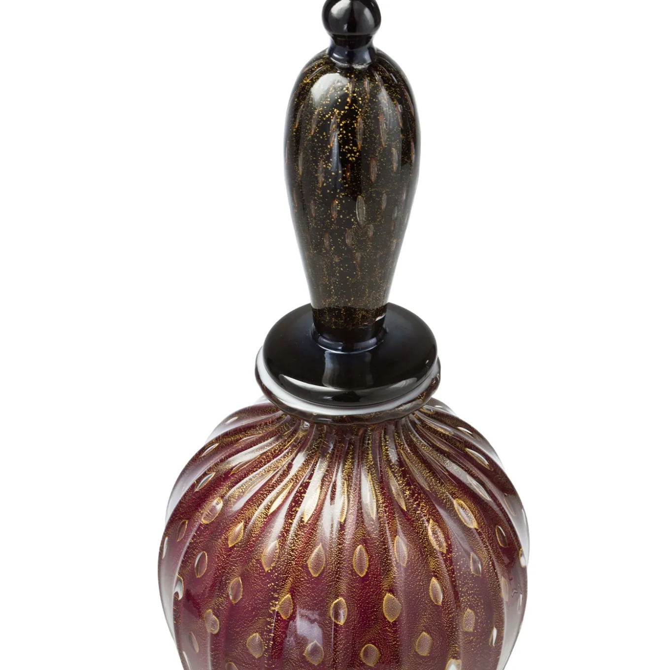 A showcase of opulence and glassblowing artistry, this singular sinuous bottle vase completed by a tapered lid and trumpet base is fashioned of first-rate red Murano glass, mouth-blown by a renowned master glassmaker. Air bubbles and 24K gold specks are trapped within the glass, the peculiar effect obtained by overlaying two different glass layers according to the “incamiciato” technique.