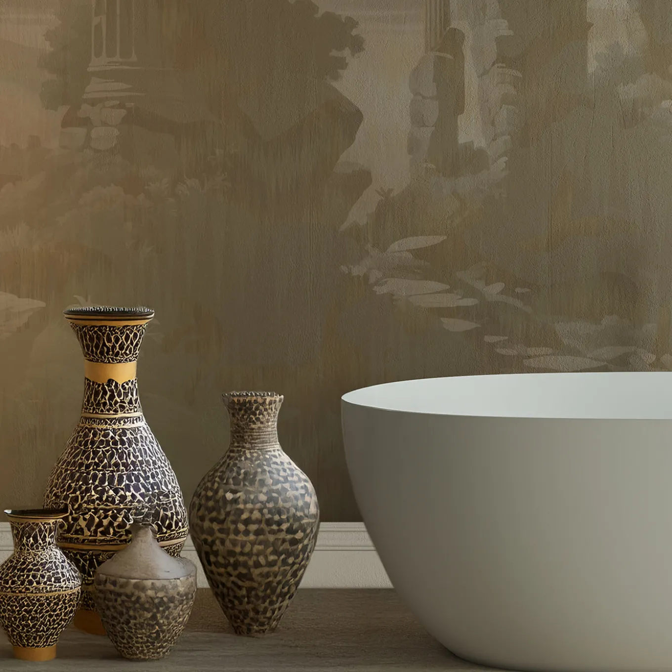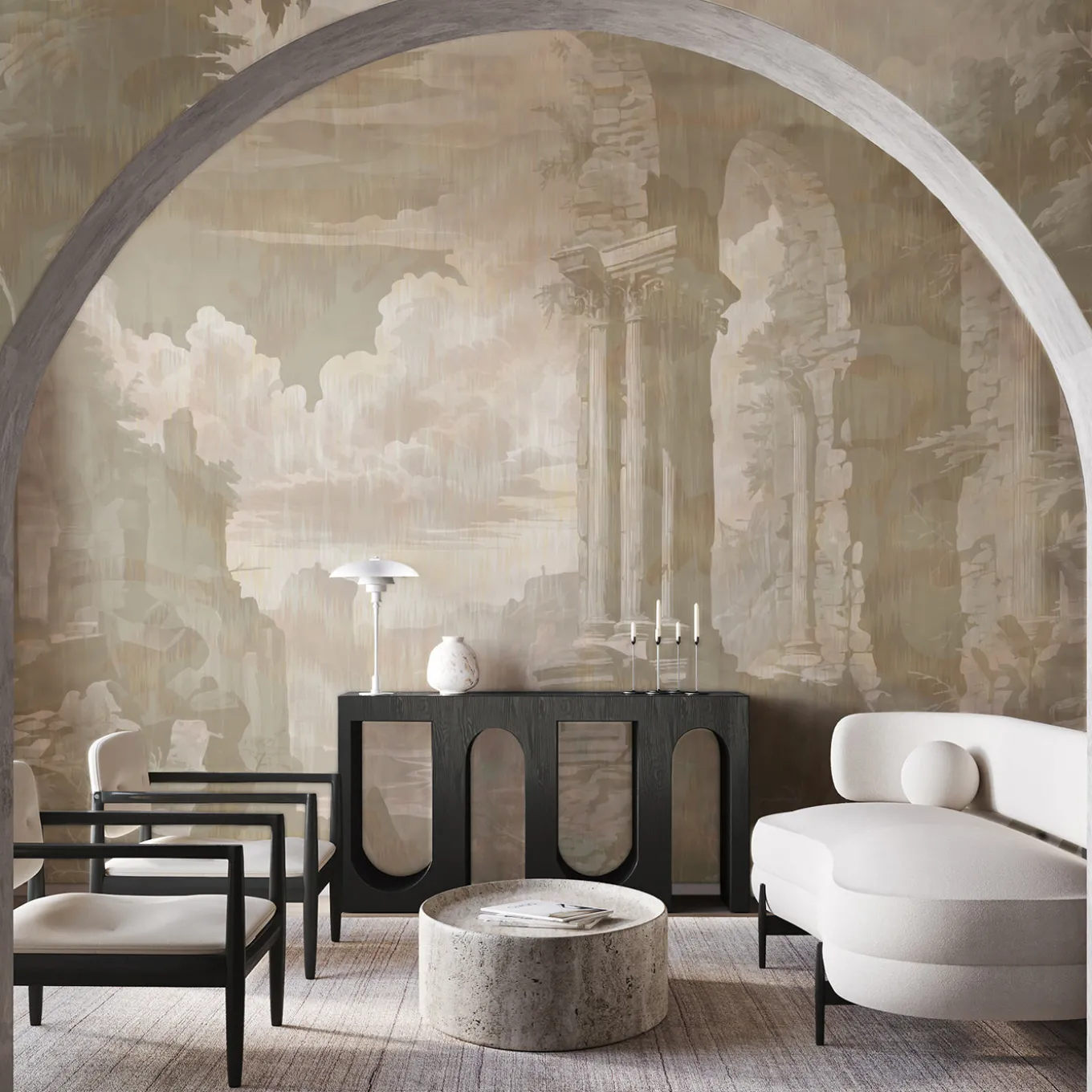This striking wallpaper features a unique blend of classical Roman ruins and a tonal Ikat pattern infused with a subtle camouflage effect. Printed on eco-friendly fine art wallpaper with a matte, drawing paper texture, it offers a high-quality tactile experience. This design dissolves historical grandeur into a modern aesthetic, creating a timeless yet unexpected visual narrative. Part of the Visioni collection. Price is indicated per square meter. Also available on Canvas wallpaper. Please contact the Concierge for further information. Design by Magnus Gjoen.