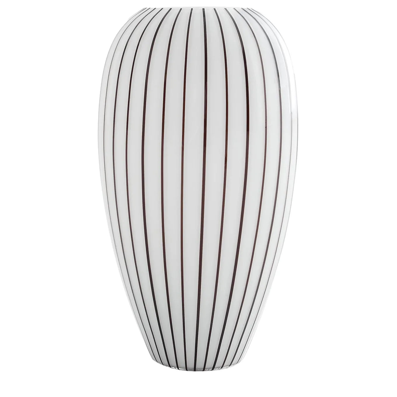 Stunning in its glamorous black-and-white aesthetic, this vase is a singular piece deftly mouth-blown from Murano glass and distinguished by a captivating striped pattern. Ancient tehcniques meet timeless flair in its bulging silhouette, where black glass sticks are applied to the white glass when still incandescent, a careful manual process named “canne” method.