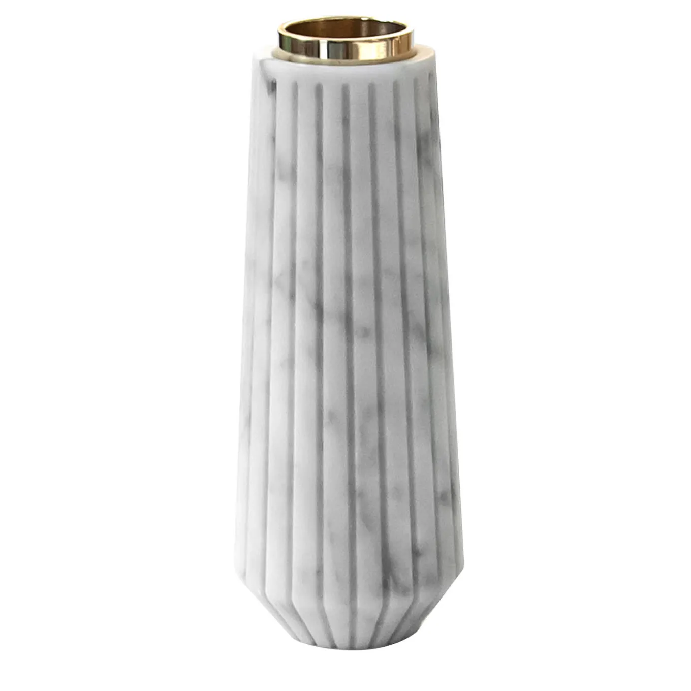 Striped candle holder in white Carrara marble and big brass. Each piece is in a way unique (every marble block is different in veins and shades) and handmade by Italian artisans specialized over generations in processing marble. Slight variations in shape, color, and size are to be considered a guarantee of a handmade creation. It’s important not to use lemon or vinegar on it, clean only with water and natural soap (like Marseilles soap), do not put it in the dishwasher.