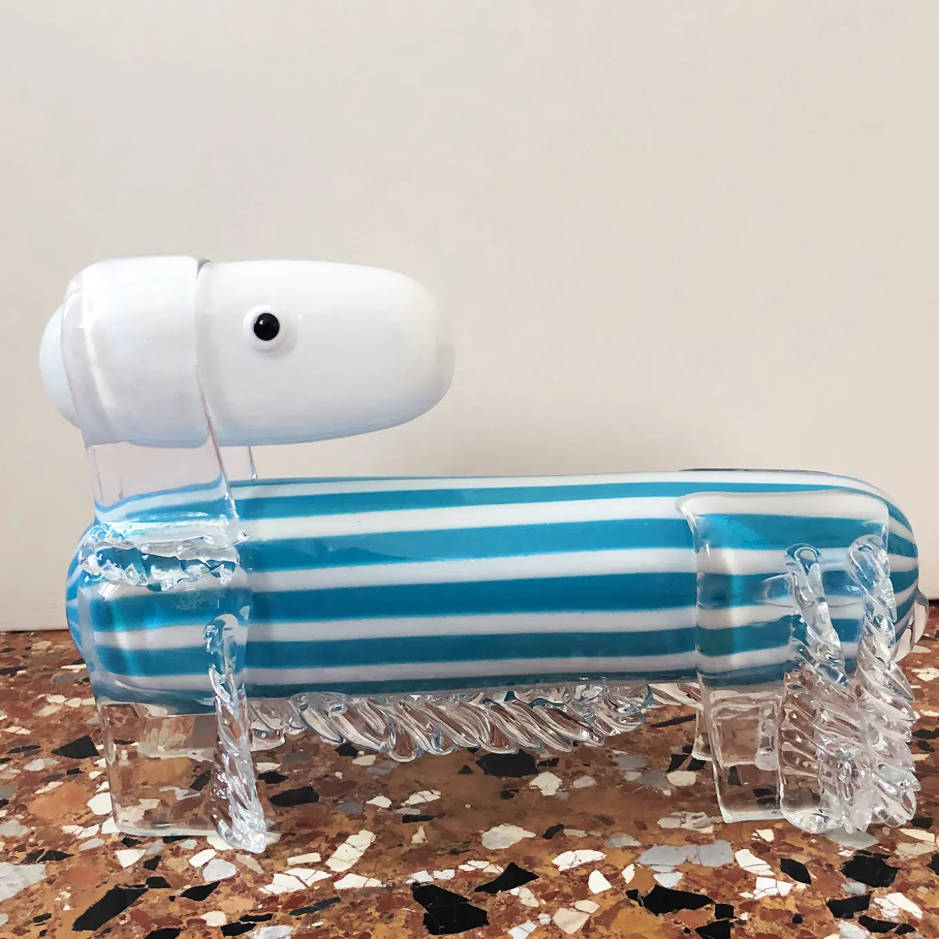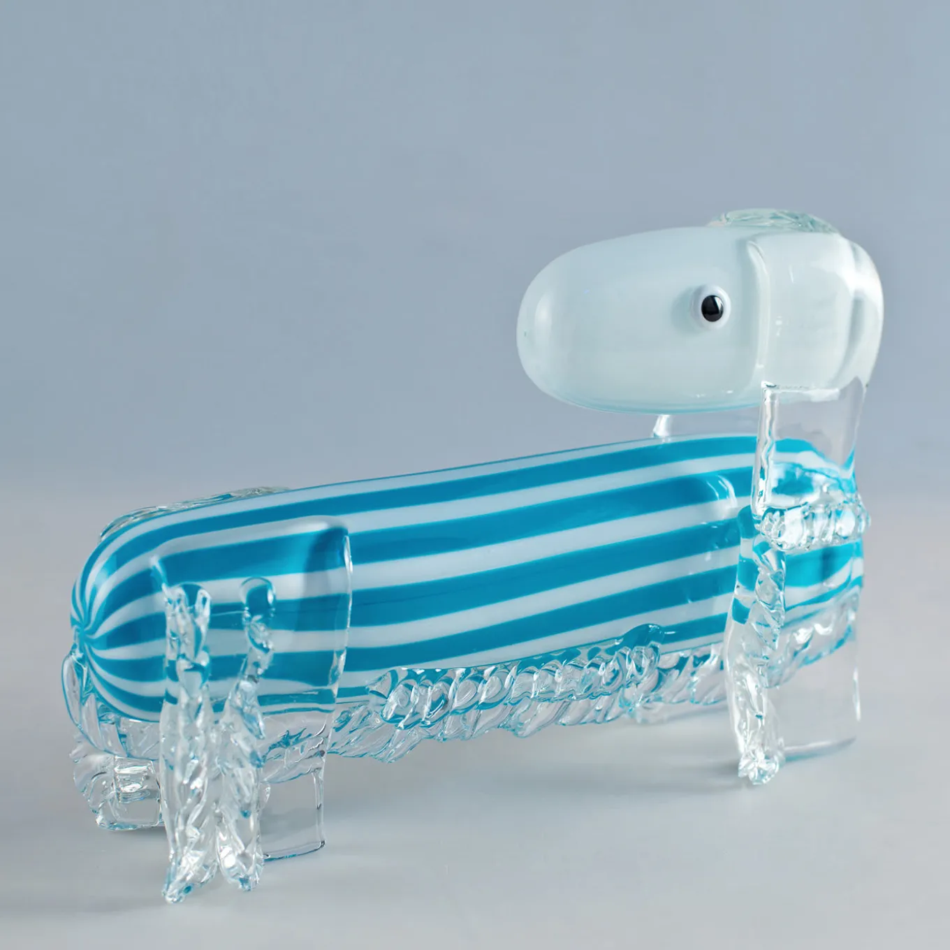 A fresh take on the city’s famed traditions, this glass dachshund statue is a nod to the 1920’s trend of glass animal sculptures. On transparent glass legs, the sculpture is characterized by the long body in blue and white stripes, topped with a white glass head. A perfect addition – or starting piece – to a whimsical collection.