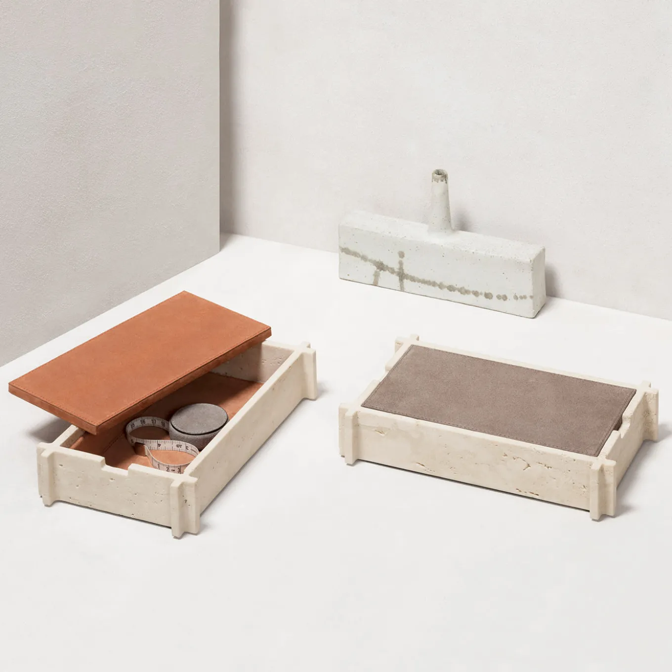 With their minimal formal line enhanced by distinctive “L” shaped corners, these boxes are perfect accessories for any space. The combination of two precious natural materials, such as travertine and the finest Italian leather, generates a perfect aesthetic balance. Custom sizes available on request.
