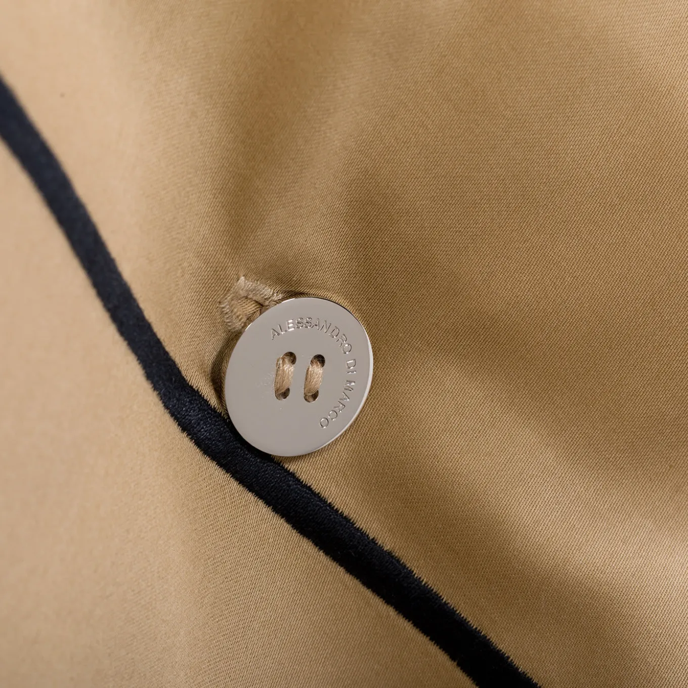 This fine satin bedding set consists of exquisite sheets in beige and black embellished with mitered corners. The pillowcases are in beige satin decorated with black embroidery. The fitted sheet in natural white. 300 thread count combed and mercerised silk dream satin in pure cotton, 110 g/m2. The buttons are in brass and the metal logo plate has been embossed and sports a palladium finish.