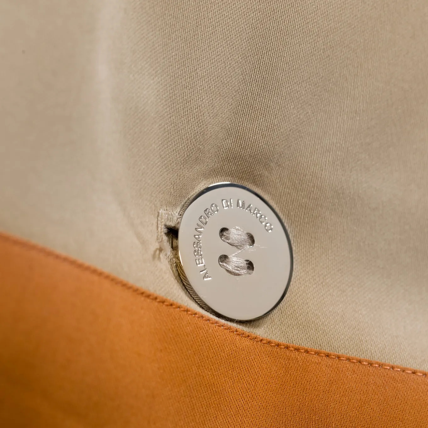 This fine satin bedding set consists of exquisite sheets in Beige embellished with a black ribbon and mitered corners. The pillowcases are in Beige satin with a double border in black and orange. The fitted sheet in beige. 300 thread count combed and mercerised silk dream satin in pure cotton, 110 g/m2. The buttons are in brass and the metal logo plate has been embossed and sports an 18K gold finish.