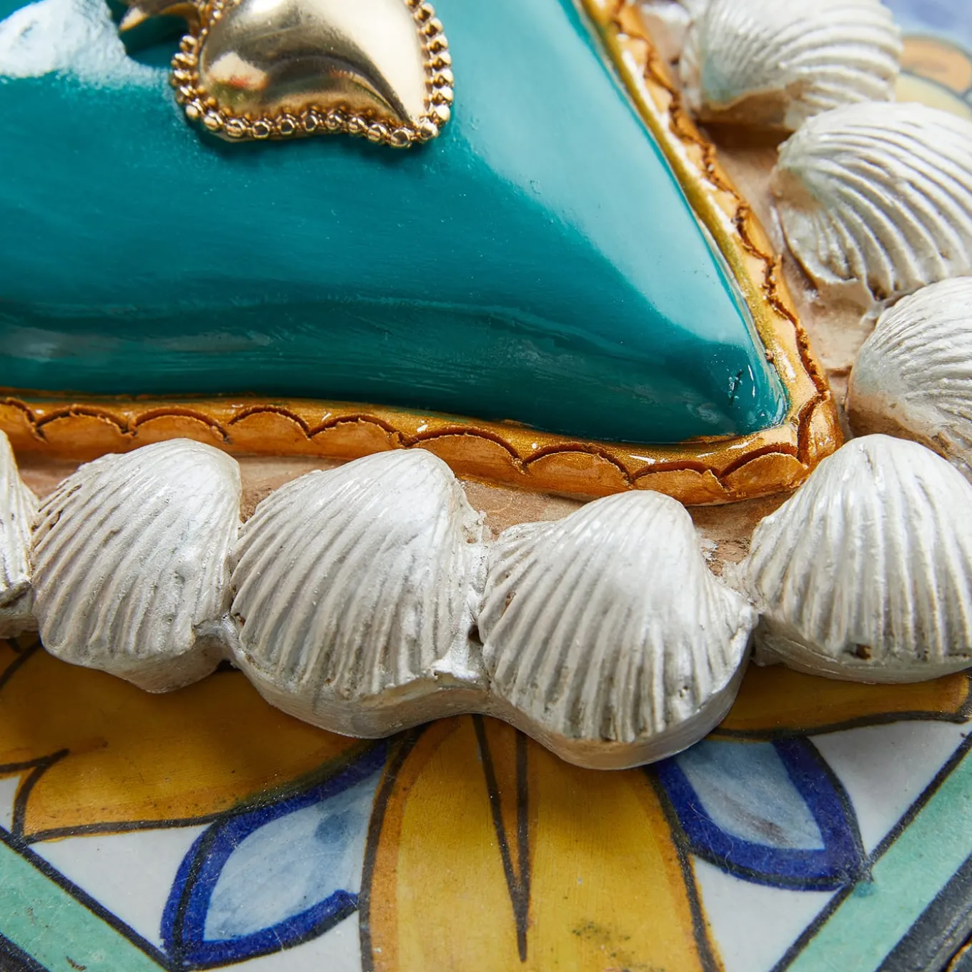 A contemporary and seasonal tribute to the traditional ex-voto, this elegant ceramic heart is entirely handcrafted and hand-painted by master artisans. Featuring a turquoise enamel finished heart with a smaller, glossy metal heart at its core, encased by golden string and framed by a seashore-inspired series of dainty white shells. This sophisticated piece is fit for a summer home.