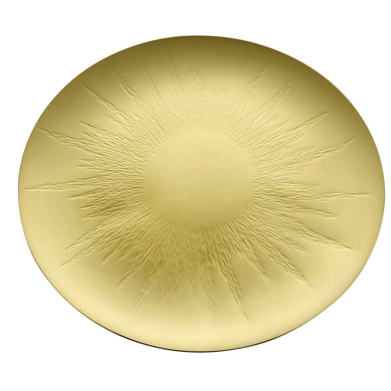 This elegant centerpiece is made in stainless steel and its elegant round and thin silhouette is enhanced by the PVD finish that is sprayed on top of the steel to give it a golden color. The sun-like decoration that adorns its center is hammered on the surface, giving the plate an interesting texture and poetically evoking the power and warmth of our brightest star. Functional and decorative, this timeless piece can be used in a classic décor or more contemporary setting.