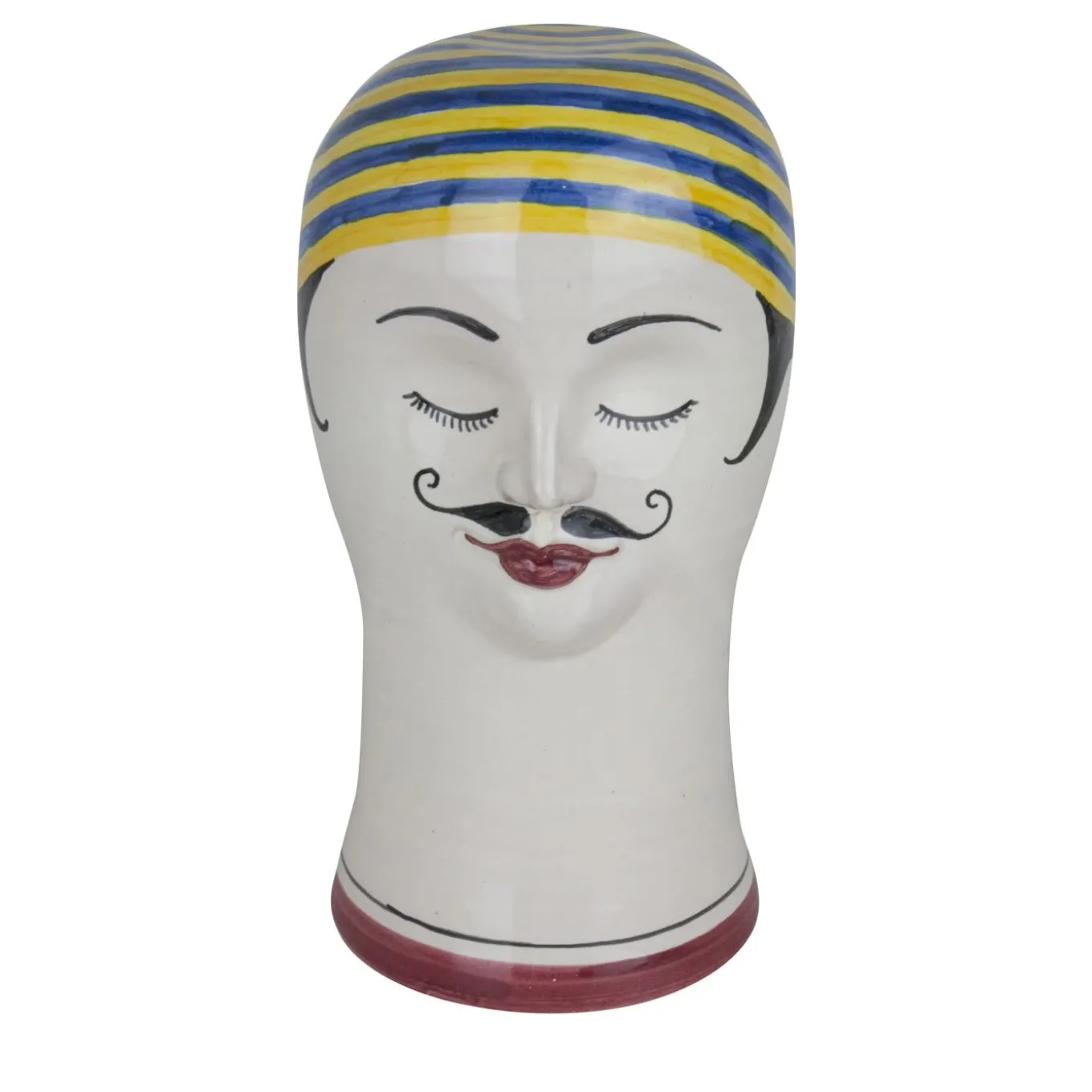 This sculptural piece makes a striking addition to the decor of any home. Its unique alluring look was achieved through the use of ceramic worked by hand on a lathe. The colorfully refined painted decorations were applied by hand. The swimmer bares a delicate mustache and a swimming cap with bright yellow and blue stripes. This piece will attract the eye anywhere it is displaced in the home.