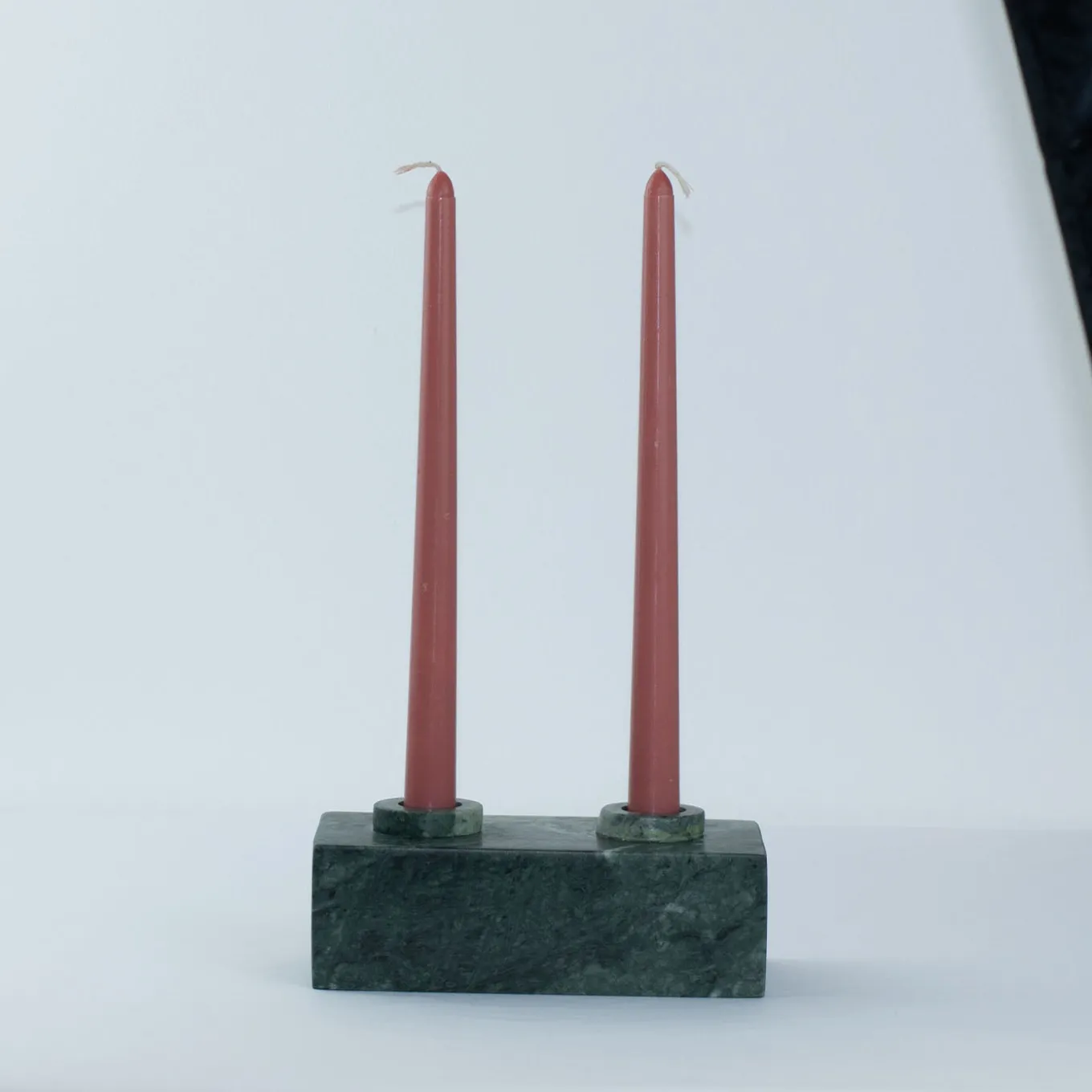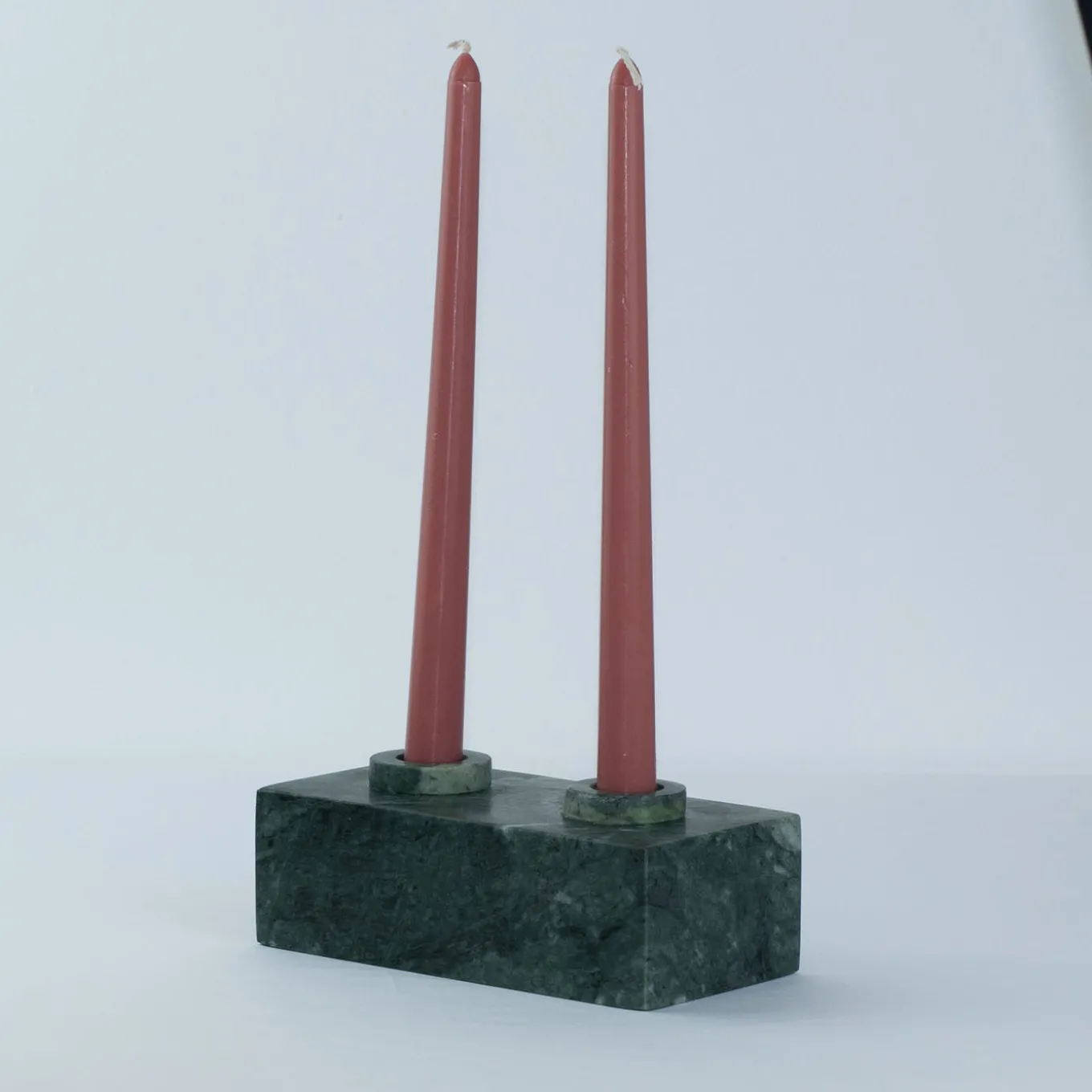 A double squared candle and tealight holder crafted from satin marble in a deep green hue. Defined by clean geometric lines, this piece is designed for modular assembly, allowing for multifunctional use. As part of a versatile collection offered in a range of marble finishes, it balances modernity with natural elegance, making it a refined addition to any interior.