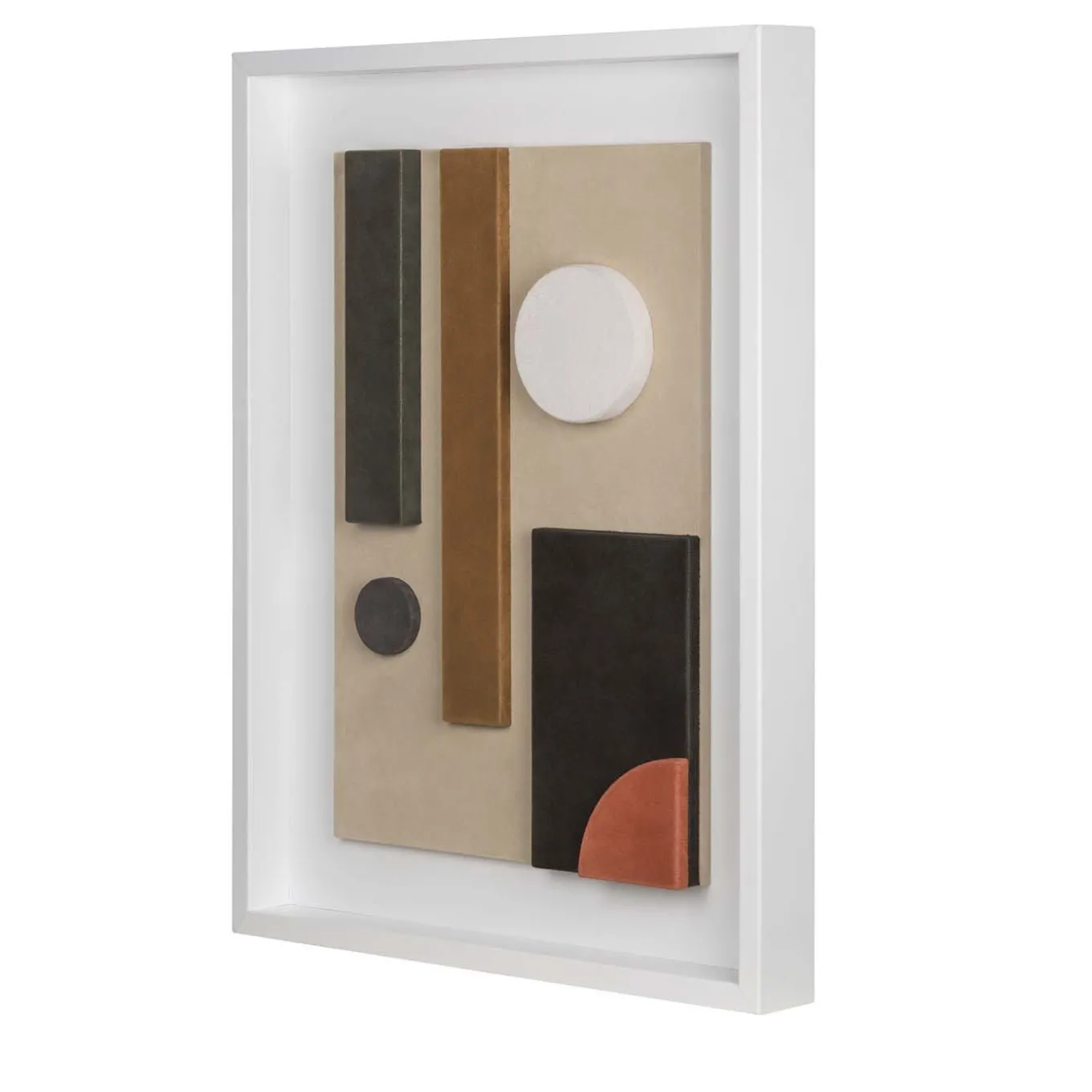Providing any room a finished and polished presence, this wall sculpture is an exclusive design by GioBagnara, made entirely of leather in a rectangular shape. Available in a limited series of abstract patterns in soft suede and with a black or white frame fashioned of nappa leather, this piece displays a beige background with an array of geometric shapes in brown, ocher, white, and black reminiscent of modernist abstract art. This wonderful collector’s item will make a well-received gift for any occasion.