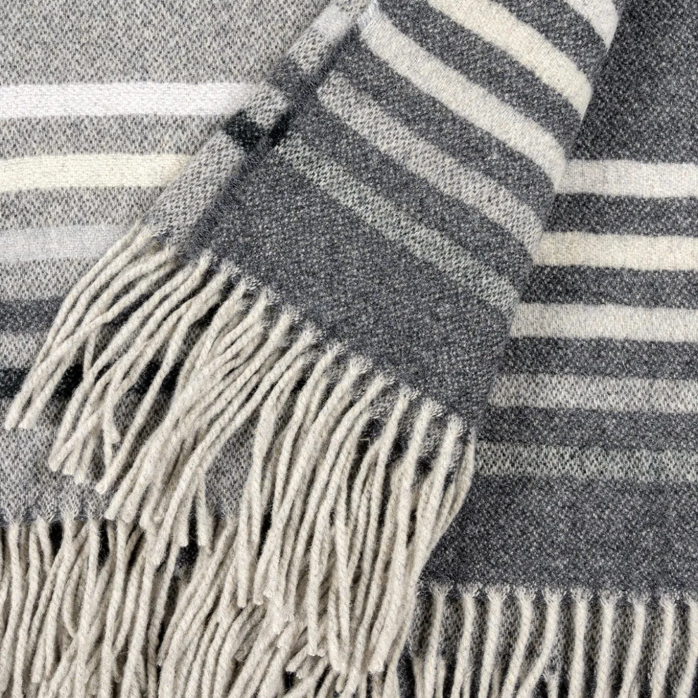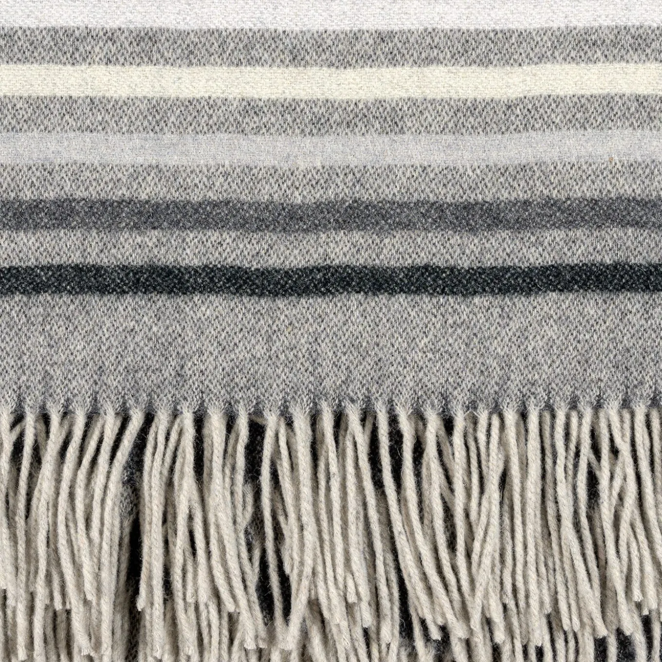 The effortless elegance of quiet decorations, neutral hues, and sartorial quality is synthesized in this one-off small blanket- Obtained by blending selected, prized cashmere (55%) and Merino wool (45%) types, it is enlivened by fringes and stripes in a palette of grays. It makes for an elegant addition to both classic and contemporary decors.