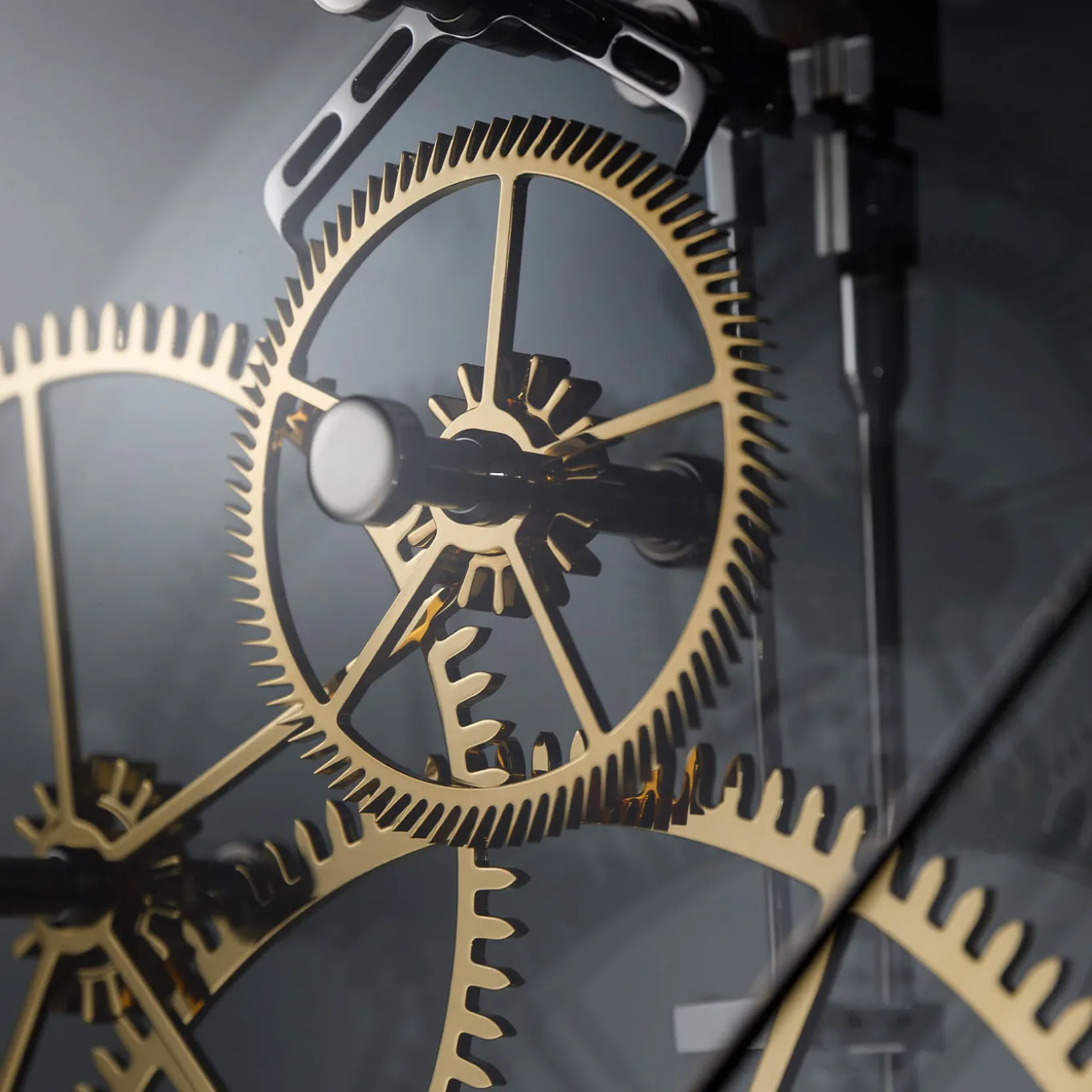 Takto Presto 02 Black is a contemporary clock that fuses minimalist design with mechanical artistry. Its frame is crafted from a thin sheet of steel with a textured black finish, and the interior is upholstered in black suede for a rich, tactile contrast. The back plate is made of acid-etched smoked mirror, adding depth and visual intrigue. The structure, in 12 mm extra-clear tempered glass, is engraved and polished with masterful precision to mark hours and minutes. Powered by a mechanical movement with Graham escapement and suspension springs, it features 24k gold-plated gears and pinions mounted onto glass panels with precision bearings. Beat rate: 5,400/h. Drive: mainspring.