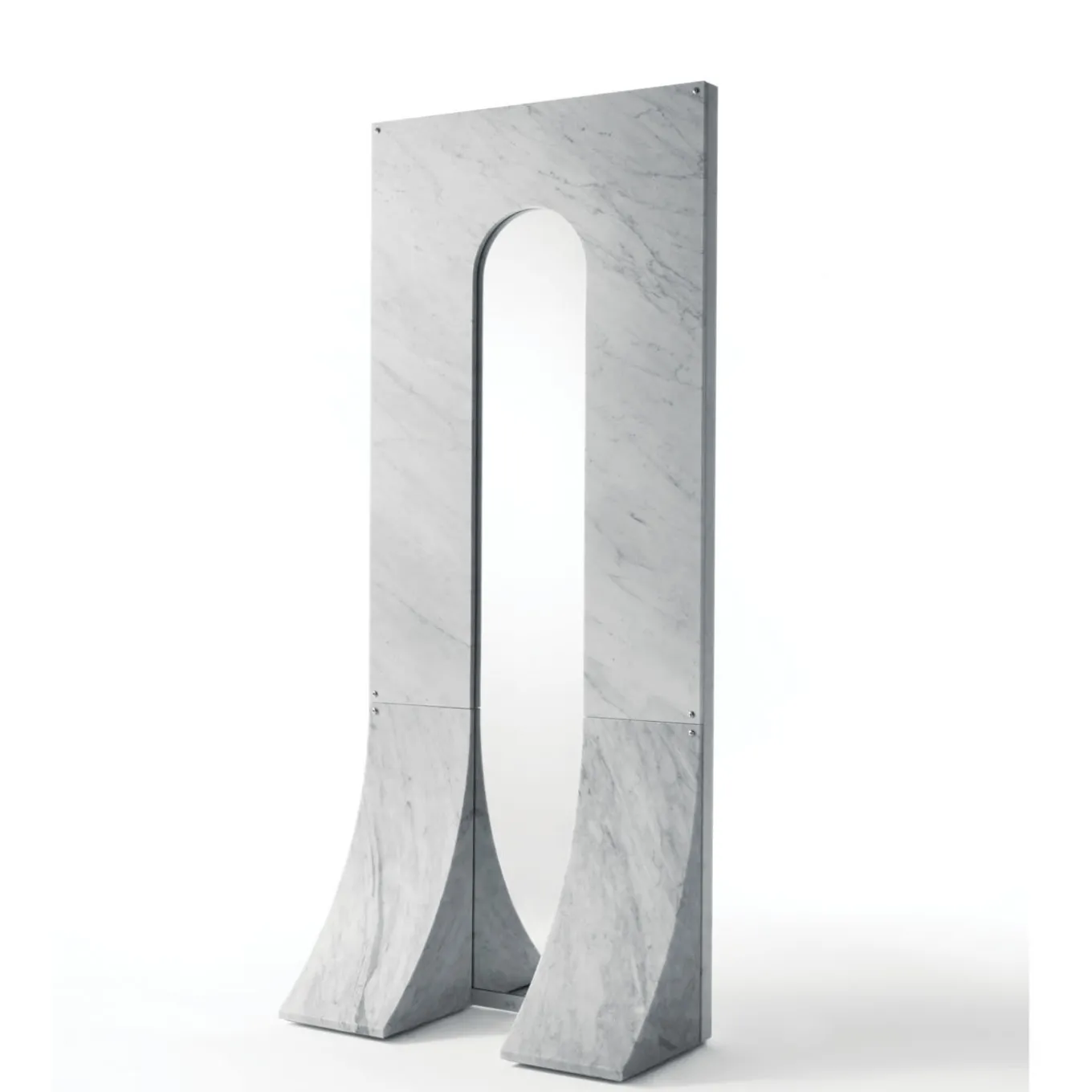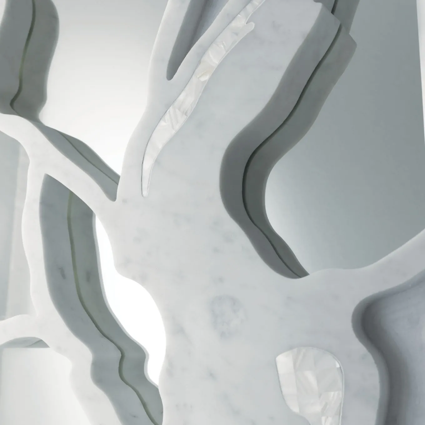 Designed by Gritti Rollo, this elegant double-sided mirror boasts a marble frame featuring an asymmetrical tangle of branches that create a unique interplay of reflections and decorations. The thin frame is enriched with mother-of-pearl inlays, which are a stunning complement to the Carrara marble frame. This elegant piece will make a statement in a modern interior. Other types of marble are available, please contact the Concierge for details.