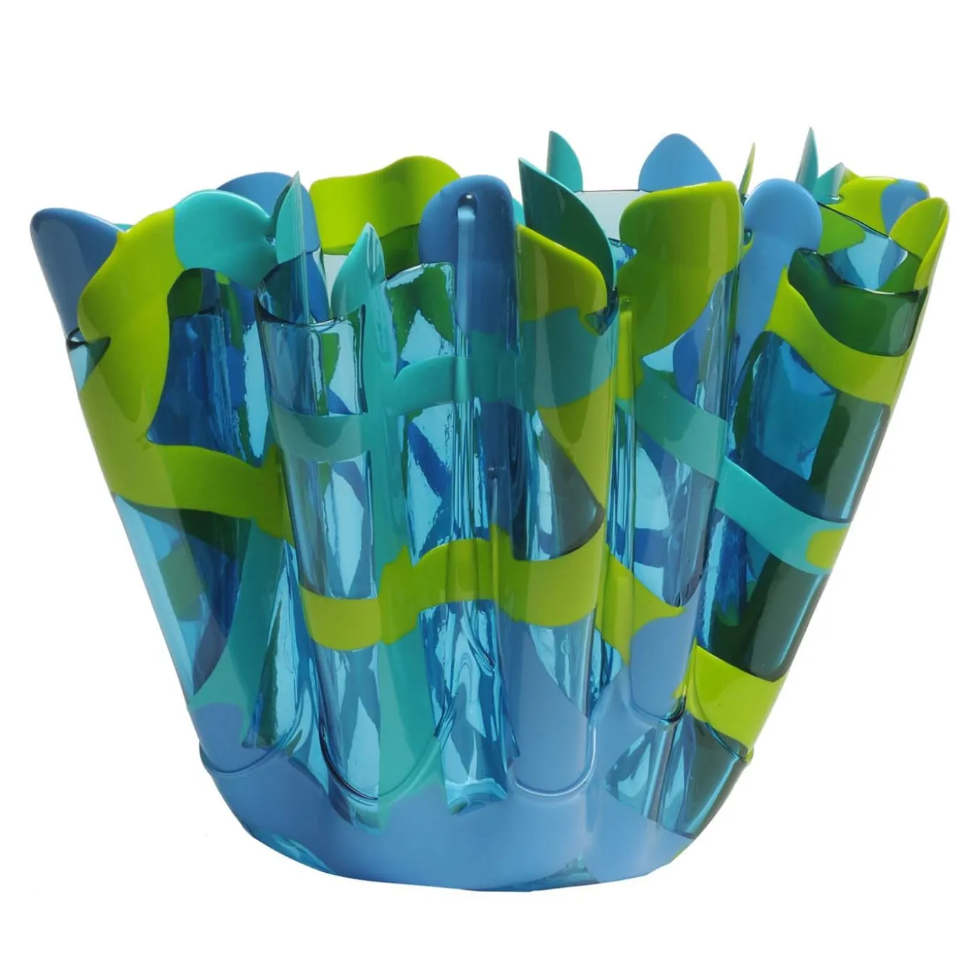 Overlapping, opaque green-and-blue lines crisscross against a blue background, creating a peek-a-boo effect for this resin vase and its contents. From the One-More collection by Paola Navone, its design recalls the draping folds of tartan fabric. Entirely crafted by artisans at Corsi Design Factory, air bubbles and other imperfections are left to make each item organic and unique. Each piece is handmade so colors may differ slightly from the image shown.