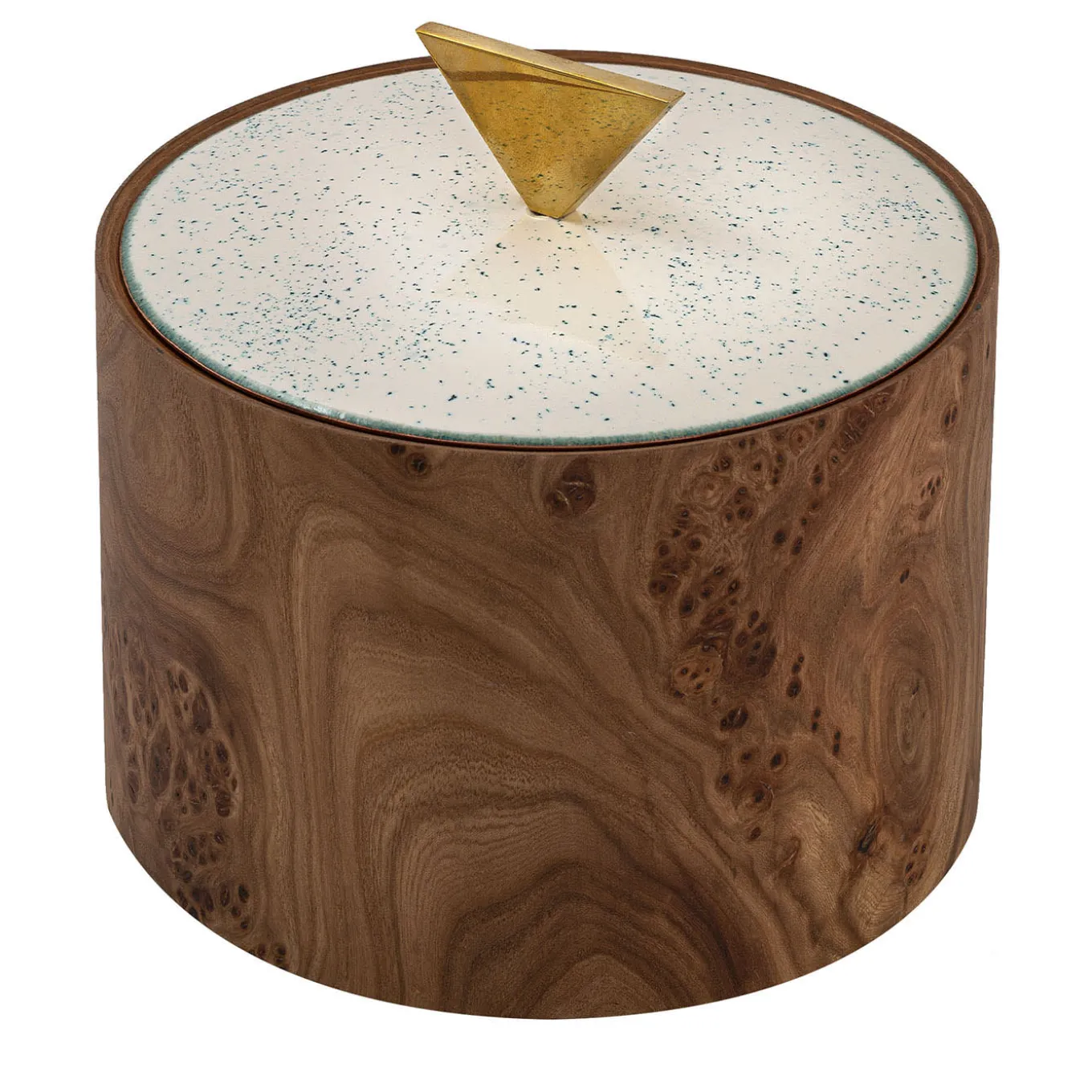 Cylindrical jewelry box made of elm root treated with bergamot oil. The stopper, concave on one side and convex on the other, is made of enameled copper. The Lid is foldable and it can be used from both sides, one characterized by a triangular knob and the other by a ring, both in brass.