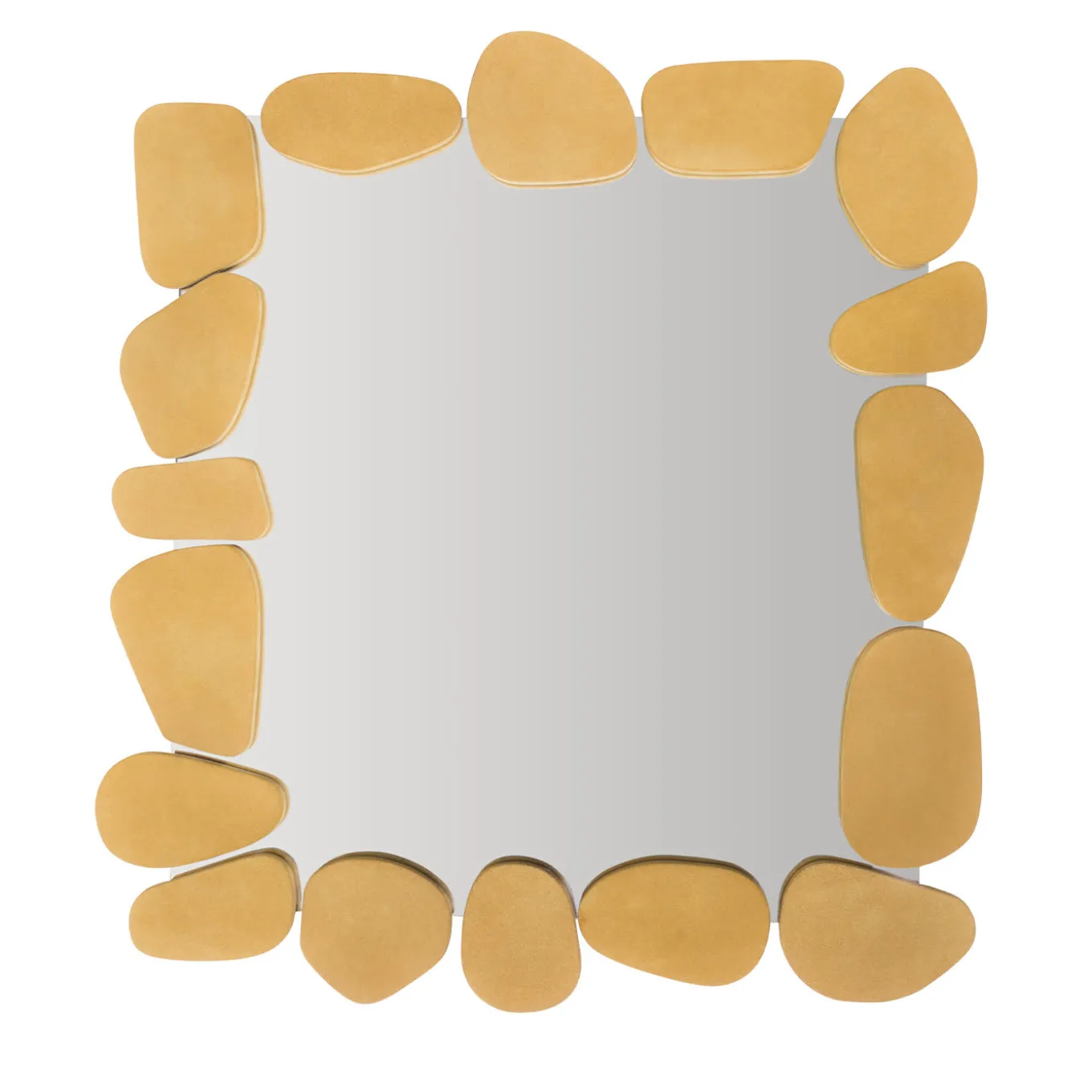 Teamed up with an eclectic and contemporary interior décor, this stylish mirror will lift up any room’s ambiance. The pebble-shaped accents set onto the wooden frame are covered with pale yellow suede to recall the traditional pavings of the fishing villages in Liguria, the inspiration behind this exclusive design by French architect Stéphane Parmentier for Giobagnara.