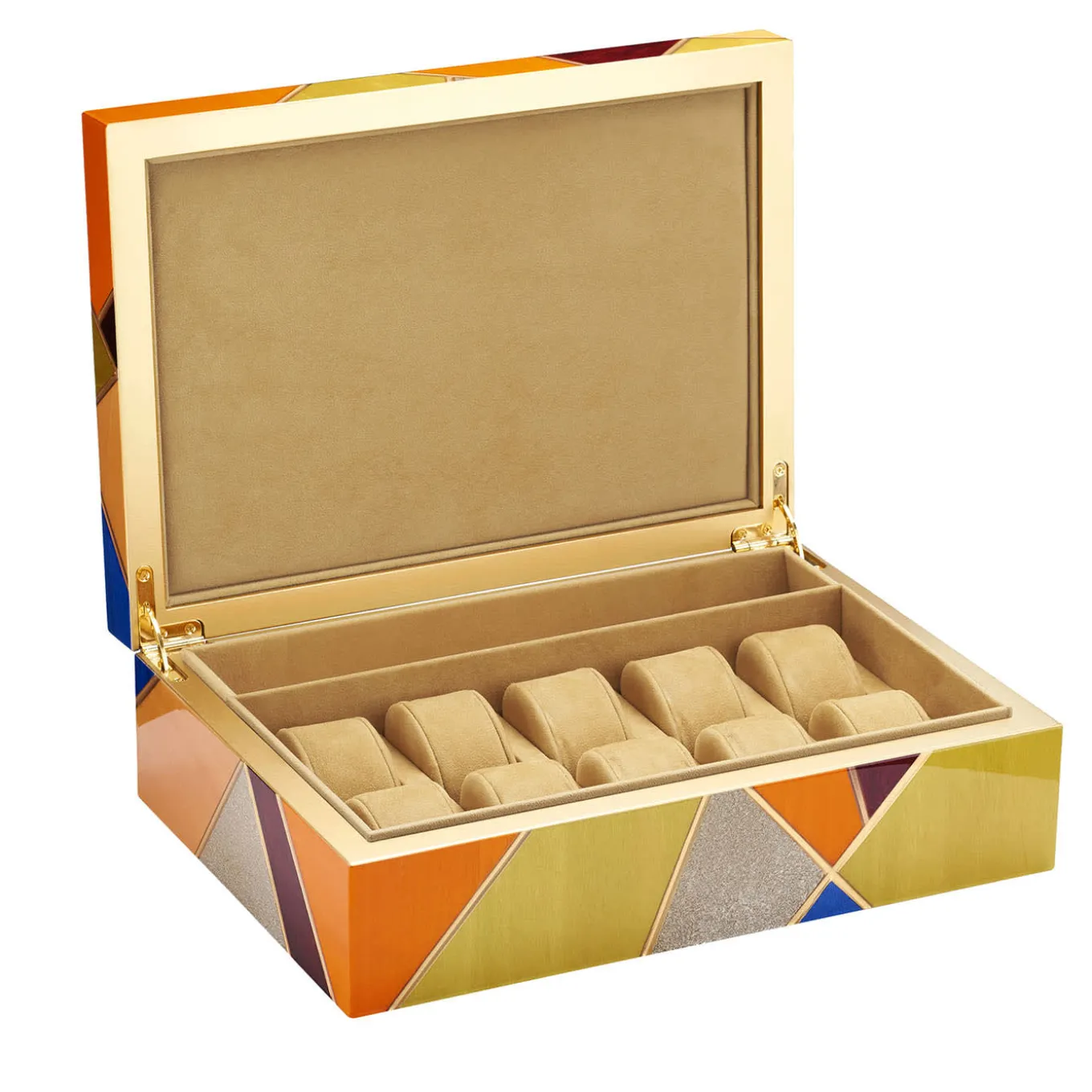 The Tellux Sibilla Watch Box elegantly encapsulates the art of storing cherished timepieces, accommodating up to 10 watches. Crafted with a striking geometric inlay, this exquisite box features an array of luxurious woods, such as bolivar, rosewood, ebony, and ash, each chosen for its unique character. Enhanced by golden profiles, the exterior showcases a meticulously brushed and polished finish, delivering a mirror-like sheen. Inside, the beige alcantara lining offers a soft and refined space for each watch, ensuring they are kept near and dear in a stylish manner. A perfect blend of functionality and aesthetic allure.