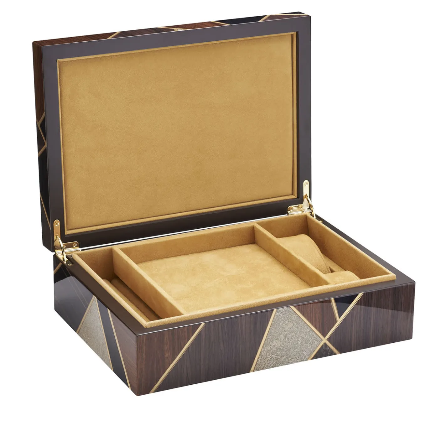 The Tellux Vulcano Jewelry Box features a distinctive design that showcases a harmonious blend of meticulously crafted geometric patterns. This exquisite piece combines various types of fine woods, including bolivar, rosewood, ebony, and ash, offering both durability and elegance. The exterior is finished with a brushed and polished look, achieving a stunning mirror-like sheen, while the intricate golden profiles enhance its luxurious appeal. Inside, this piece is lined with soft beige Alcantara. This jewelry box serves as an ideal addition to any sophisticated home décor, seamlessly marrying functionality with artful design.