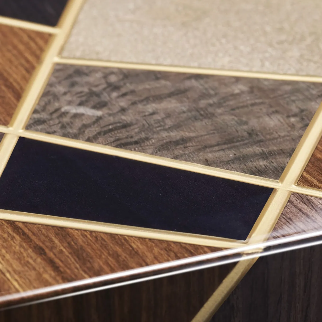 Watch aficionados will enthusiastically welcome this watch holder as a precious treasure chest where to neatly organize their collection. The veneer and inlay are crafted by hand, resulting in a superb geometric design where prized ebony, bolivar, rosewood, briar, and ash are outlined by pure gold profiles. The piece is lined in beige Alcantara and externally brushed and polished.