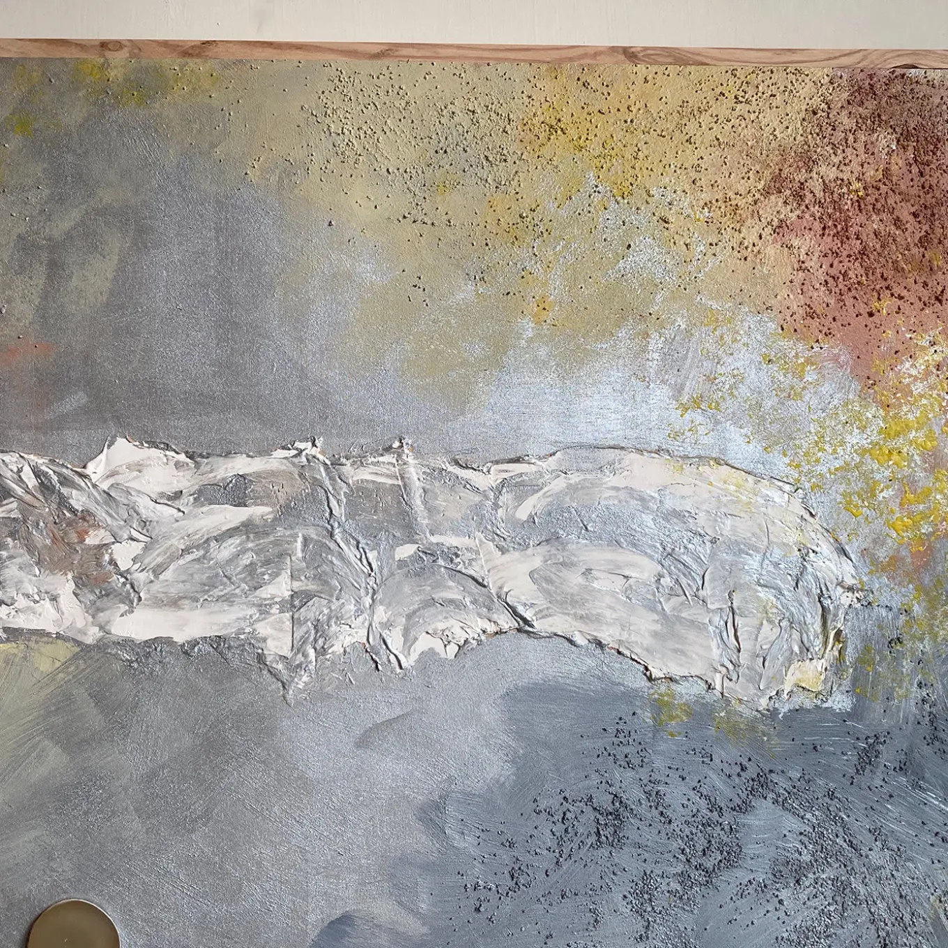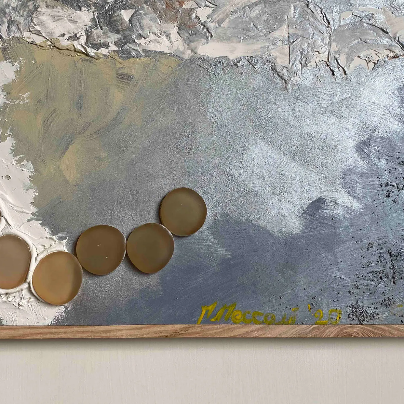 Created by Mascia Meccani in 2020, this stupendous work of art combines a mixed-media wooden decorative panel with a fine cherry wood wall hanger composed of two sleek and practical cylinders. Entirely crafted and painted by hand, it features a mesmerizing combination of shades enhanced with stucco and sand. This piece can be reproduced in different sizes upon request, with possible variations in the design due to its handcrafted nature.