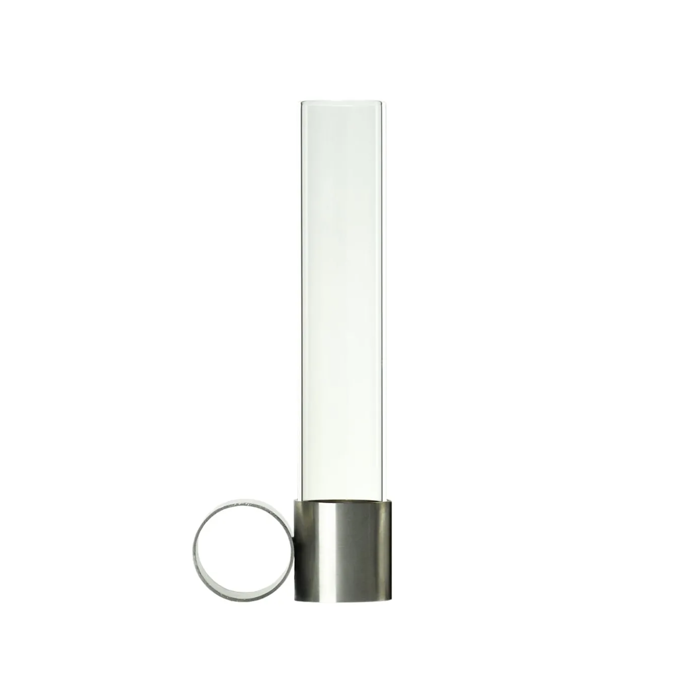Candleholder and flower holder in a single object, Tempio del Tempo was conceived as a small altar for the home, created through the union of simple and symbolic shapes that fit together without connections and remain divisible: two stainless steel rings joined together with invisible welding, a pure soy wax candle with a cotton wick and a borosilicate glass vase. The removable closure of the steel base is made of recycled rubber and creates the ideal support to accommodate candles. Candle and glass vase included.
