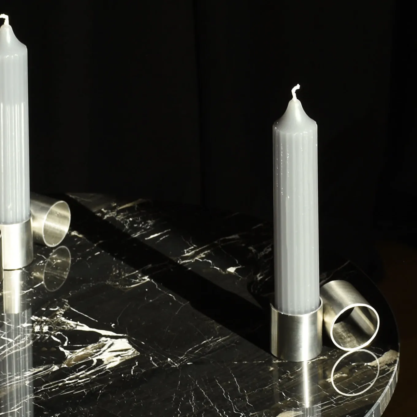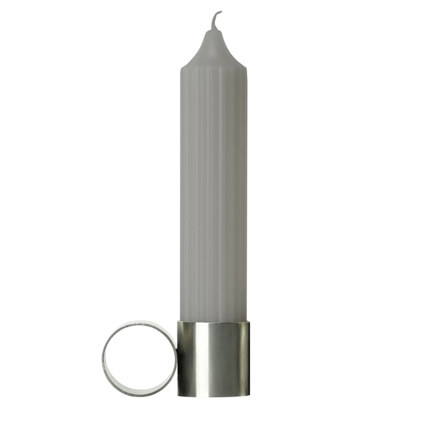 Candleholder and flower holder in a single object, Tempio del Tempo was conceived as a small altar for the home, created through the union of simple and symbolic shapes that fit together without connections and remain divisible: two stainless steel rings joined together with invisible welding, a pure soy wax candle with a cotton wick and a borosilicate glass vase. The removable closure of the steel base is made of recycled rubber and creates the ideal support to accommodate candles. Candle and glass vase included.