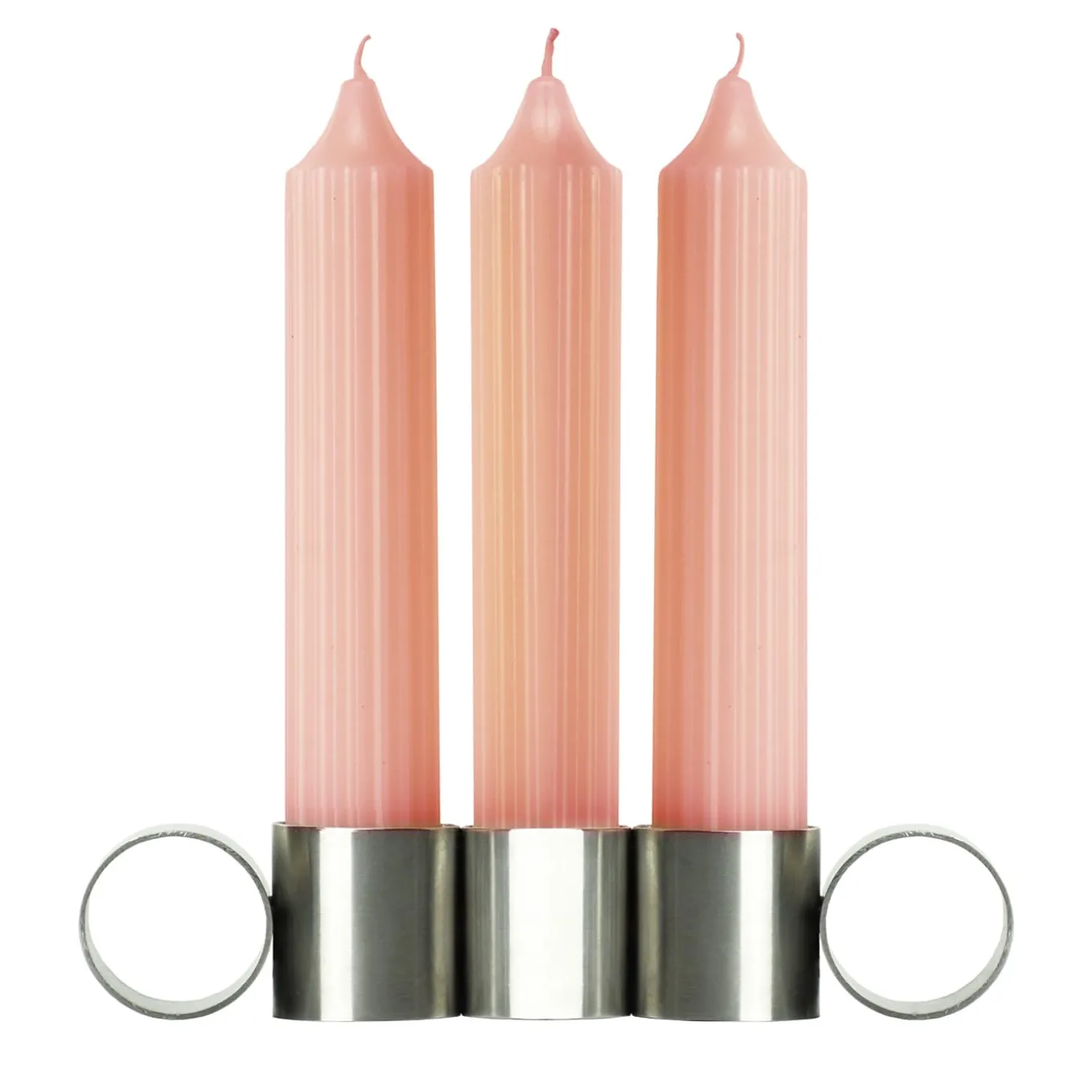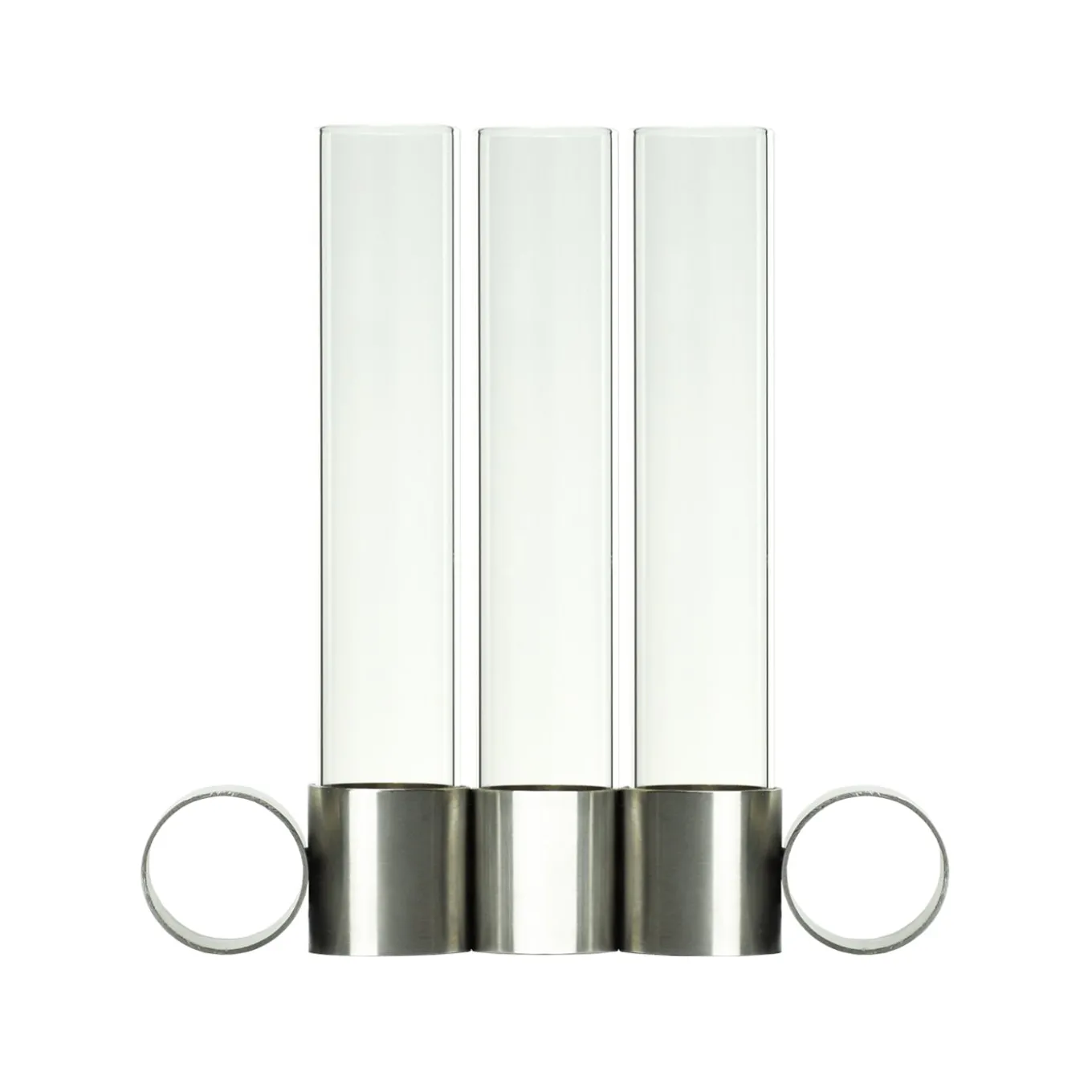 Candleholder and flower holder in a single object, Tempio del Tempo was conceived as a small altar for the home, created through the union of simple and symbolic shapes that fit together without connections and remain divisible: two stainless steel rings joined together with invisible welding, a pure soy wax candle with a cotton wick and a borosilicate glass vase. The removable closure of the steel base is made of recycled rubber and creates the ideal support to accommodate candles. Candles and glass vases included.