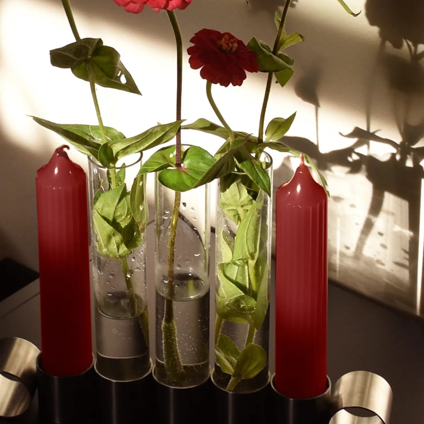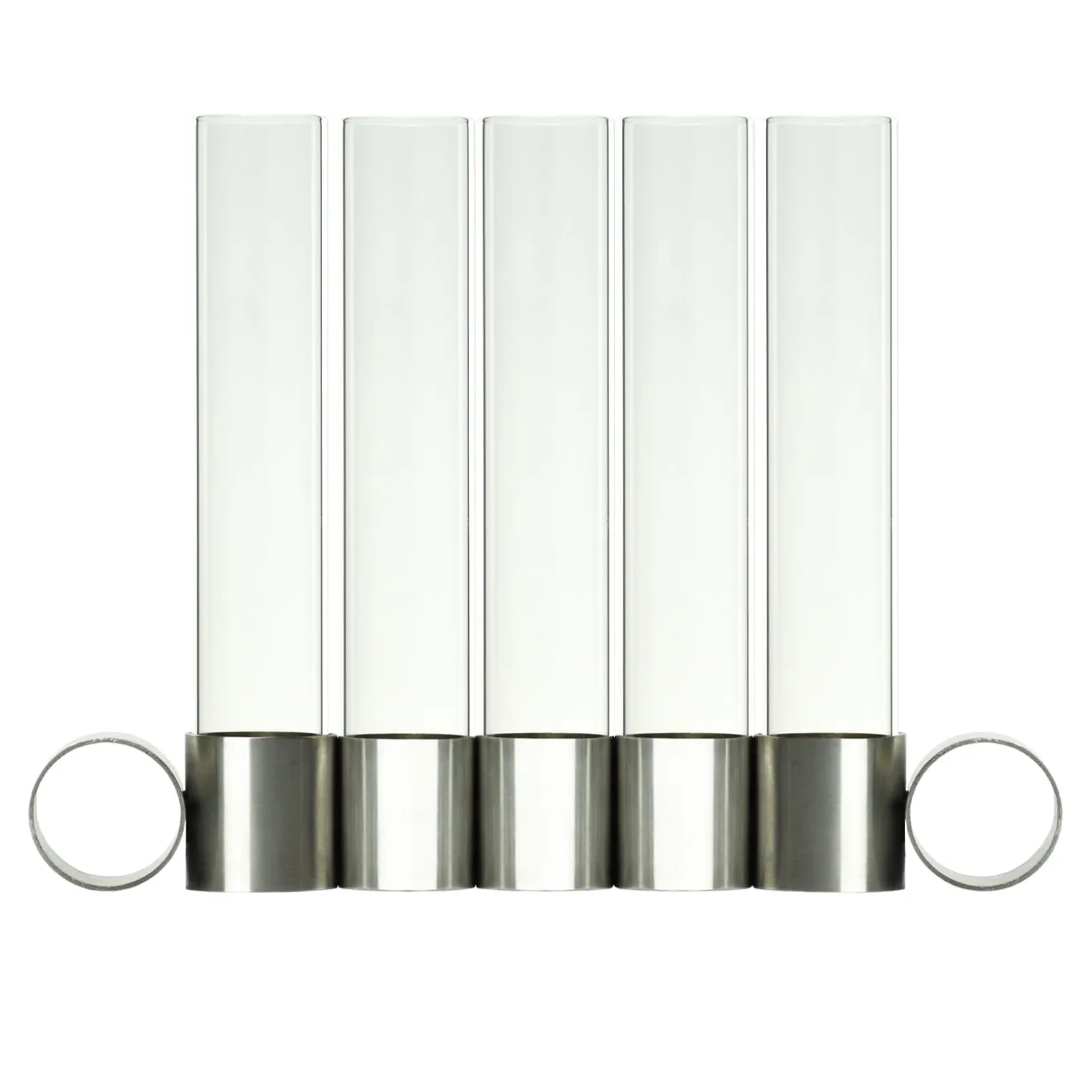 Candleholder and flower holder in a single object, Tempio del Tempo was conceived as a small altar for the home, created through the union of simple and symbolic shapes that fit together without connections and remain divisible: two stainless steel rings joined together with invisible welding, a pure soy wax candle with a cotton wick and a borosilicate glass vase. The removable closure of the steel base is made of recycled rubber and creates the ideal support to accommodate candles. Candles and glass vases included.