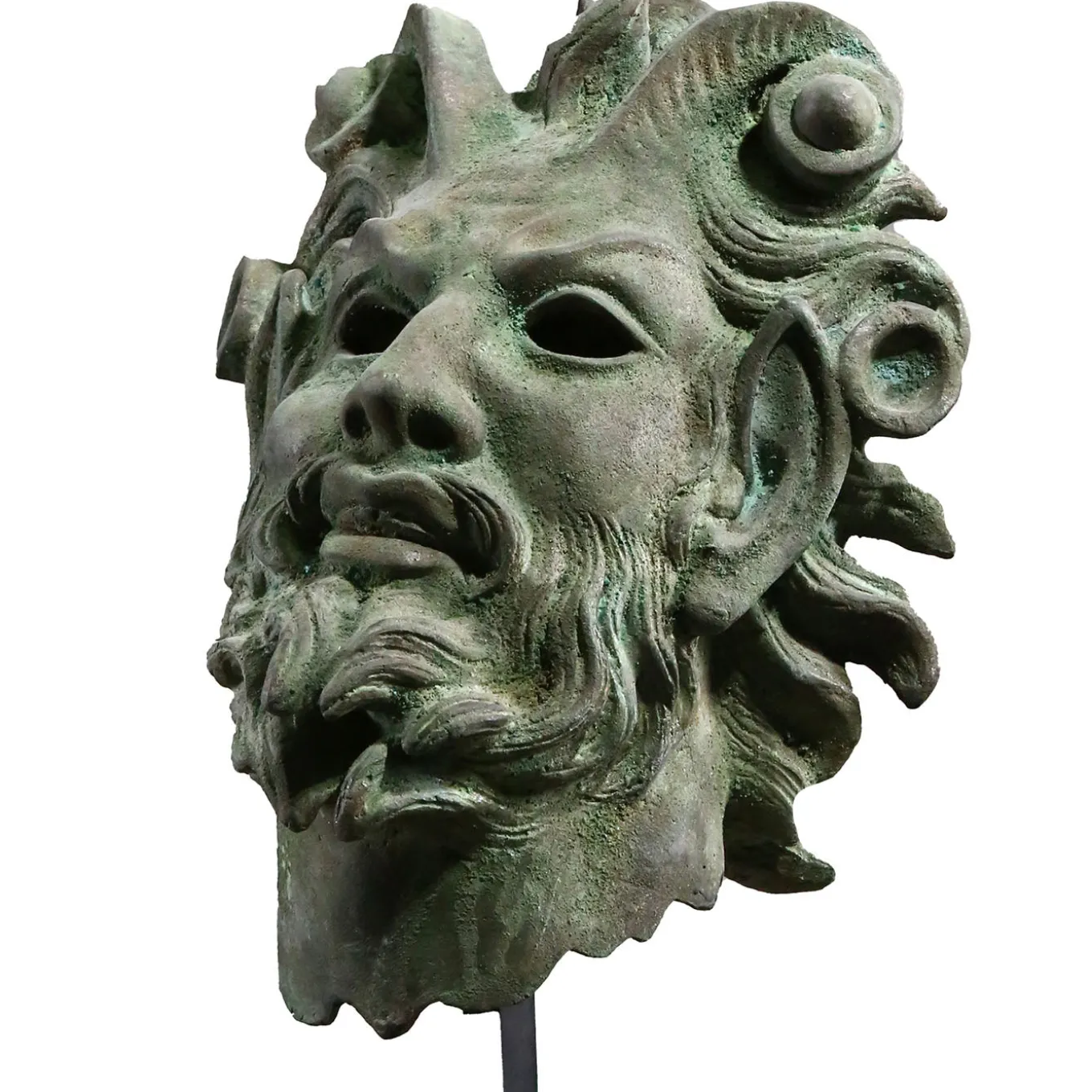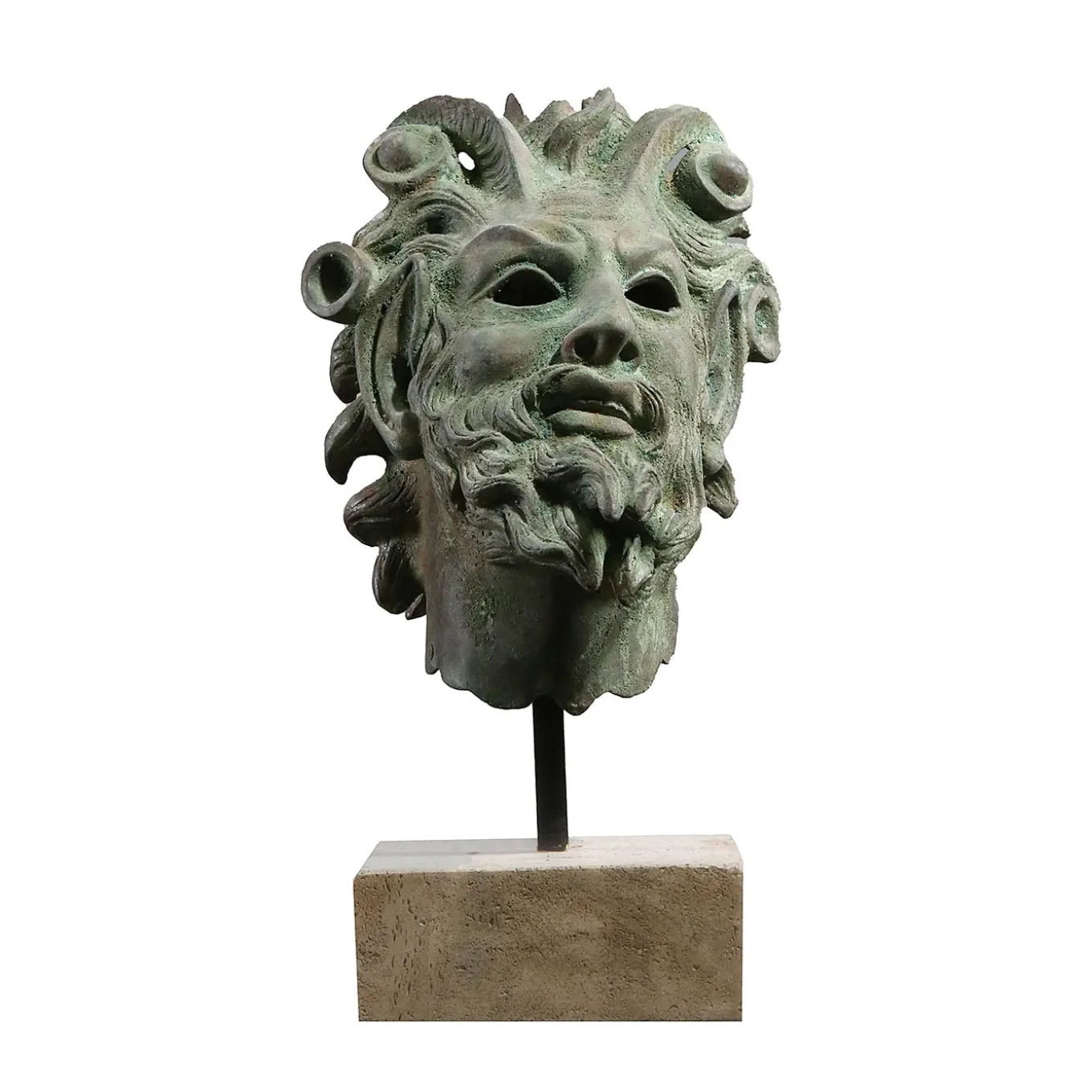 This exquisite piece represents the head of a bearded faun, clearly depicted with his goat horns and elongated ears. The faun was the Roman equivalent of the ancient Greek satyr, a mythological half human–half goat creature, manifestation of forest and animal spirits that would help or hinder humans at whim. The use of bronze with the lost-wax casting technique and a green patina resting on a marble pedestal, adds a touch of classical allure to any decor.