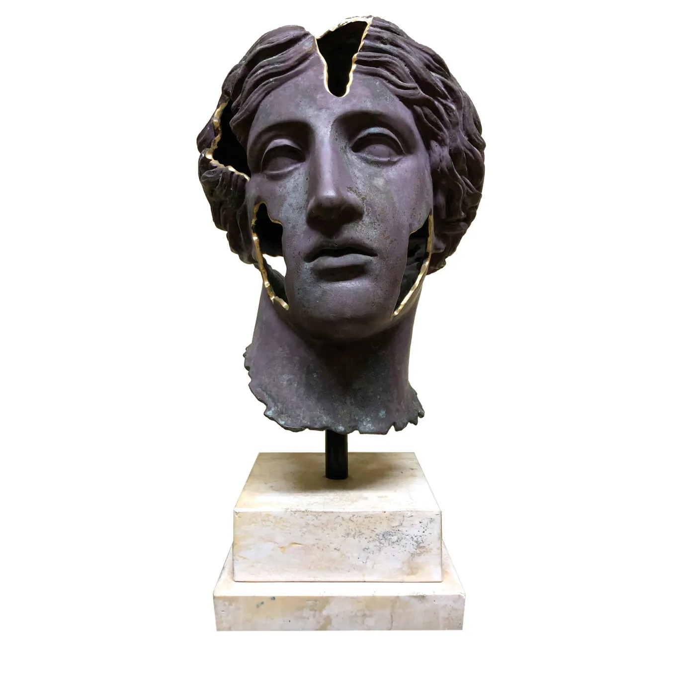 The solemn, statuesque charm of bronze heads is enlivened by an exquisite glamorous twist in this sculpture thanks to the gold finish accenting the indented holes’ perimeter. A precious piece that stands out for its discreet yet impactful contemporary allure, it represents the head of Venus set in a tiered marble base and crafted with the aid of green and purple patinas for striking chromatic interactions.
