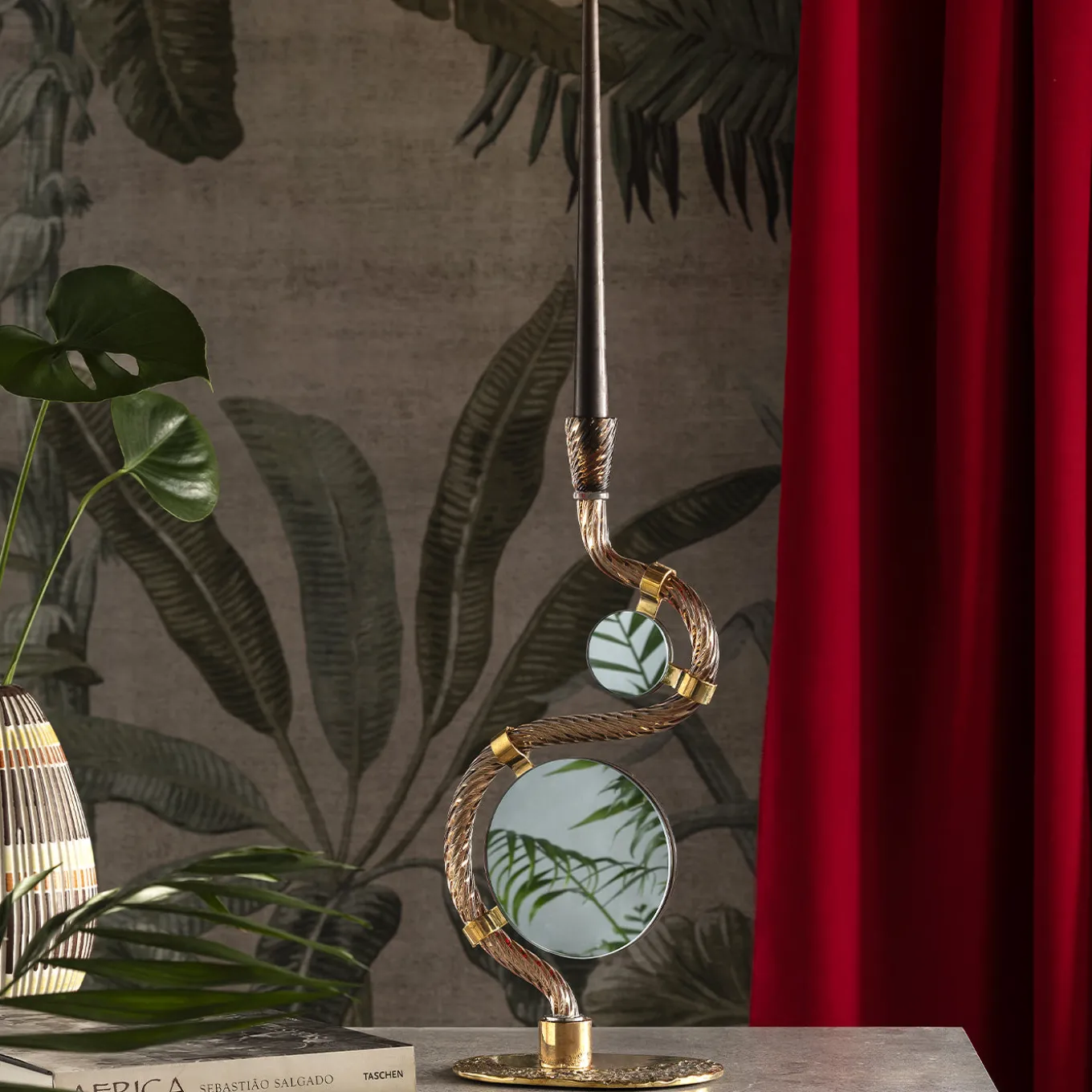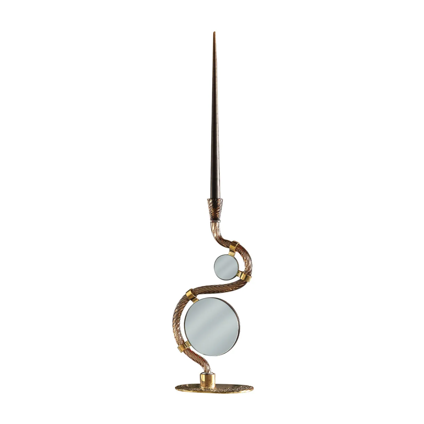 The 4 Bridges over Canal Grande double mirror and Murano glass candle holder features a sinuous mouth-blown curve in deep coffee brown Murano glass accented by four hammered brass bridges, inspired by Venice’s iconic Rialto, Accademia, Ponte degli Scalzi and Constitution bridges. The piece combines multi-colored mirrors with a burnished brass base, creating a dynamic interaction of light and texture that reflects Venetian heritage in a contemporary design. A candle is included in the price.