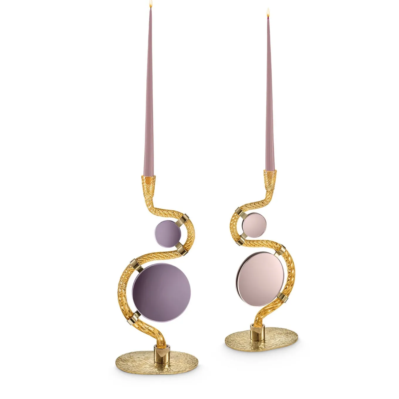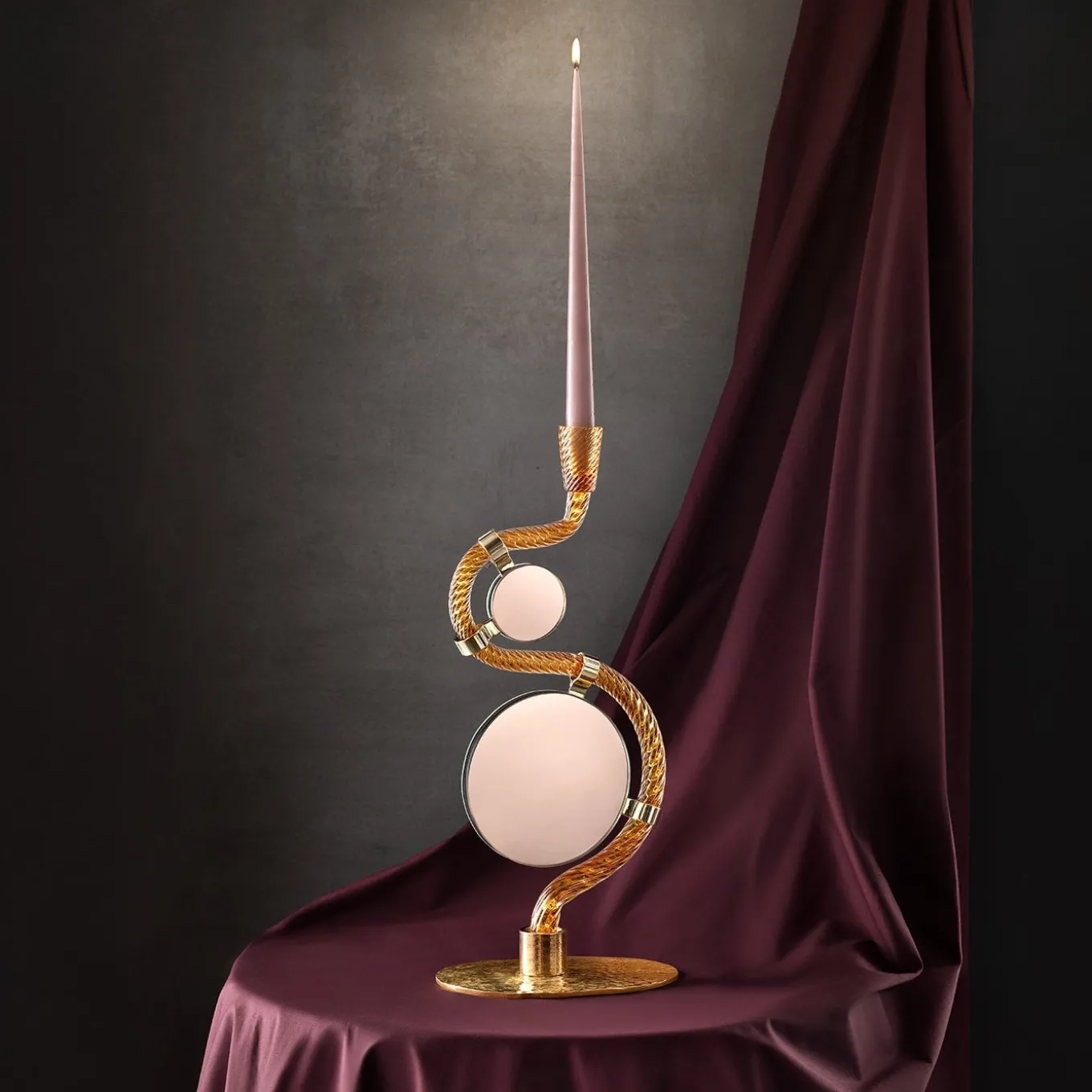 The vertical mirrors and gold Murano glass candleholder in this collection represent Aina Kari’s deep connection to Venetian heritage and meaningful design. The sinuous, mouth-blown gold glass, with its four hammered brass “bridges,” evokes the beauty of the Canal Grande and its iconic bridges. The combination of Murano glass and colorful mirrors by Giovanni Botticelli captures and refracts light, blending tradition with modern craftsmanship. The candle included is white. The two mirrors are double-sided, in purple and pink color.