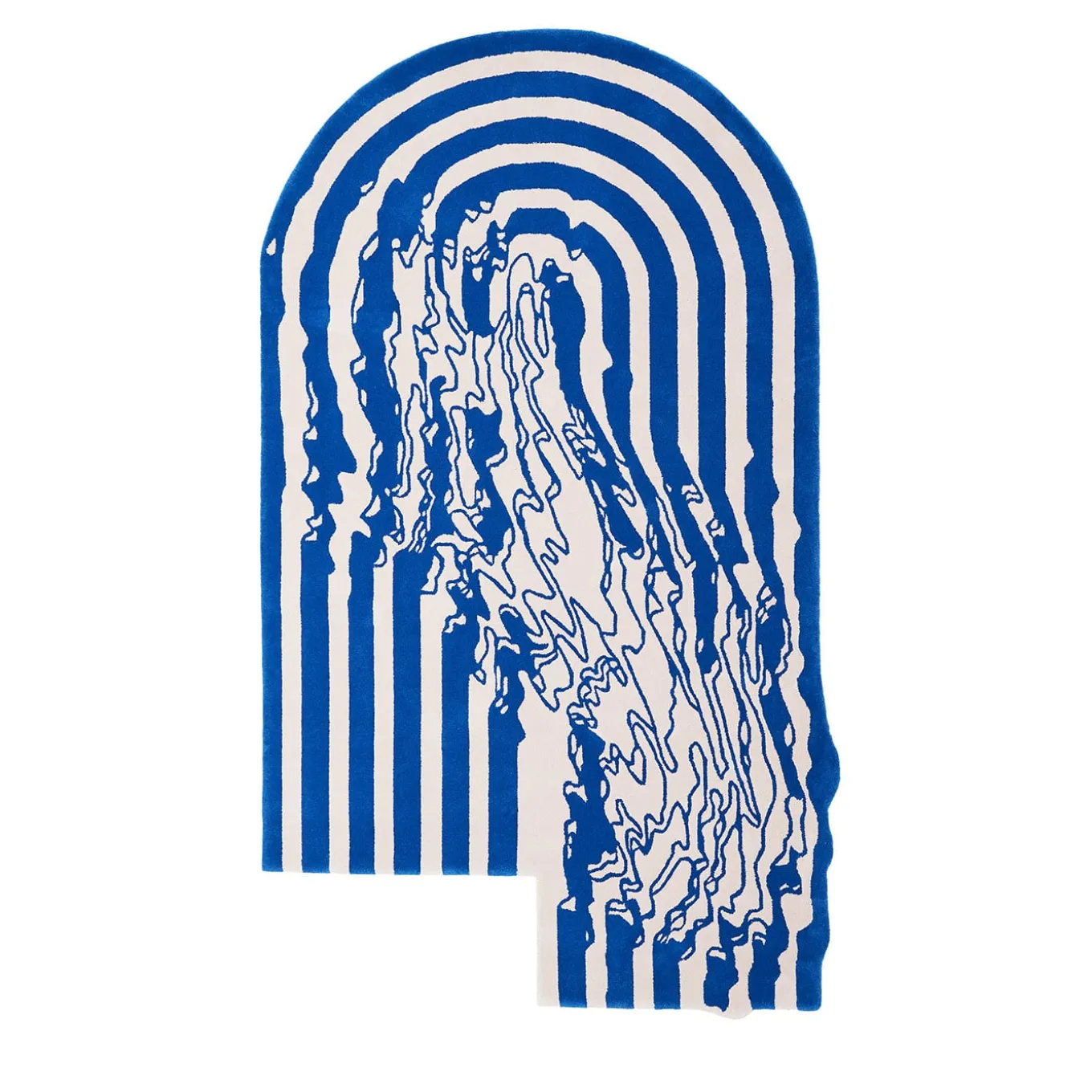 Stimulating in its asymmetrical design of blue and white stripes, this hand-tufted rug combining New Zealand wool and Tencel lyocell belongs to “The Floor Is Lava” Collection. The stripes appear as seemingly melting under a lava flow for a truly impactful effect sure to take center stage in any decor. Please contact the Concierge for care instructions and customization options.
