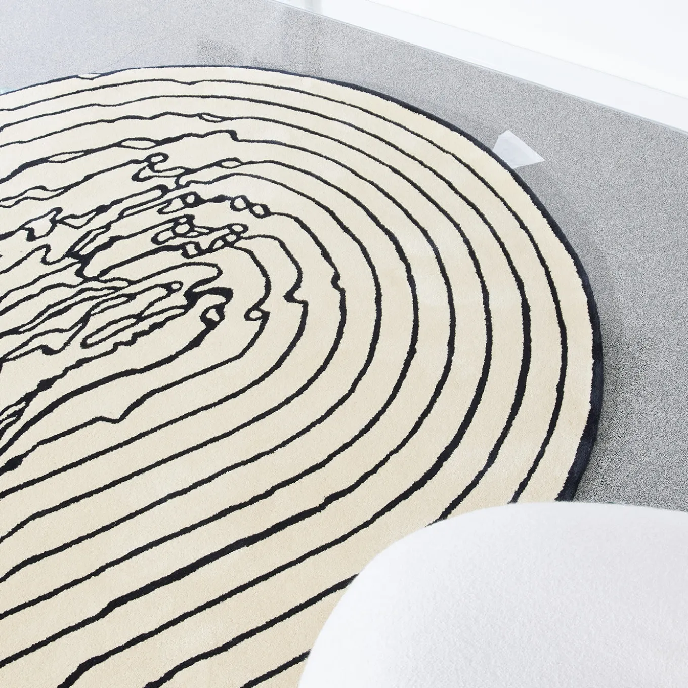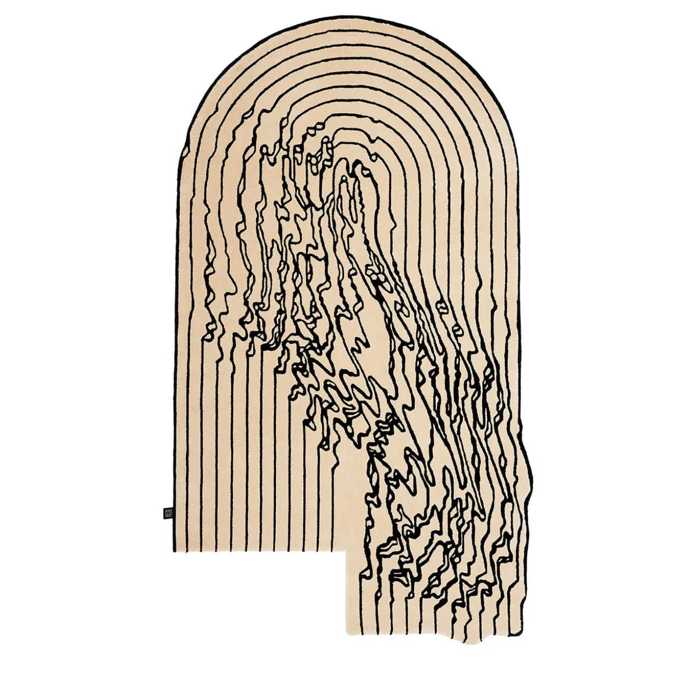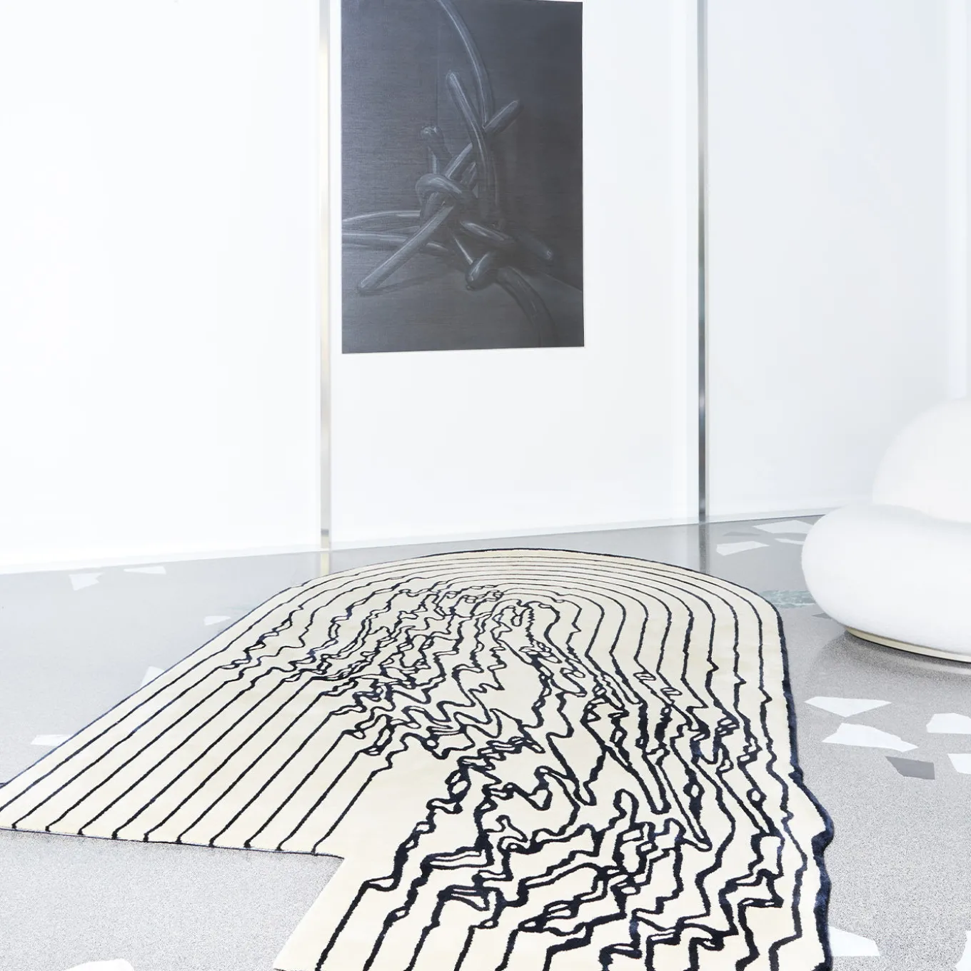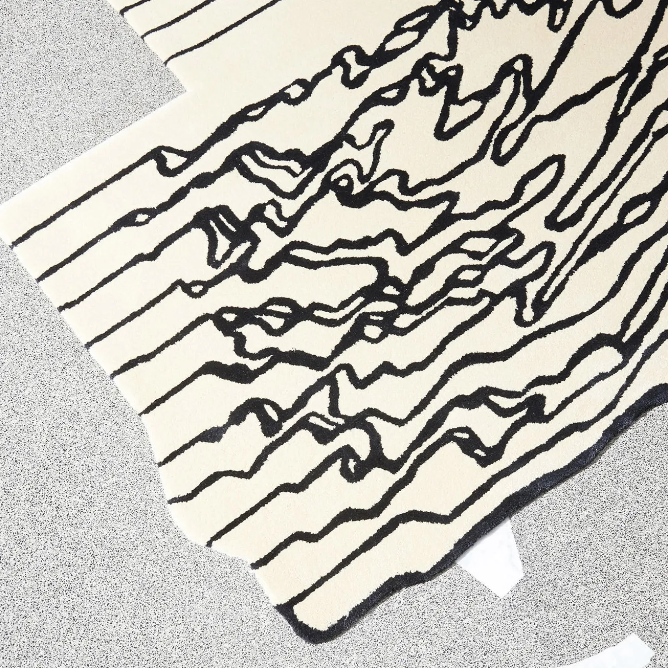 Part of “The Floor Is Lava” Collection, this water-resistant rug boasts an impactful asymmetrical design where the black lines warp as seemingly melted by some source of heat. It is hand-tufted from New Zealand wool and Tencel lyocell and delicate, please set the vacuum cleaner at medium power to prevent damage. Please consult the Concierge for optional sizes, colors, and detailed care instructions.
