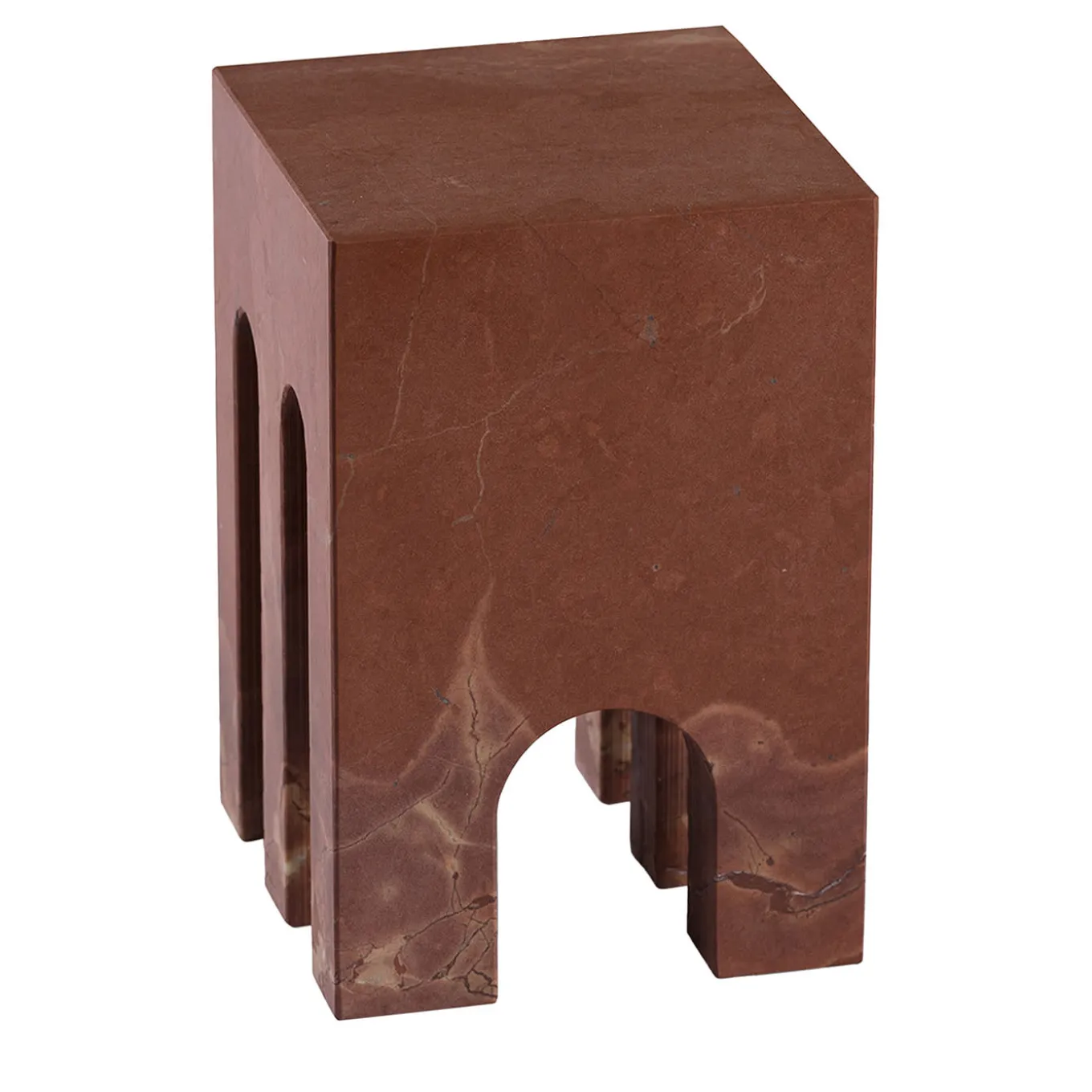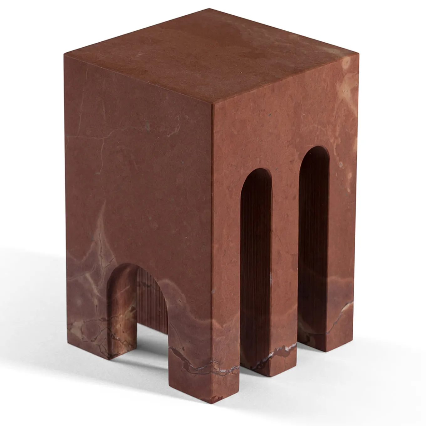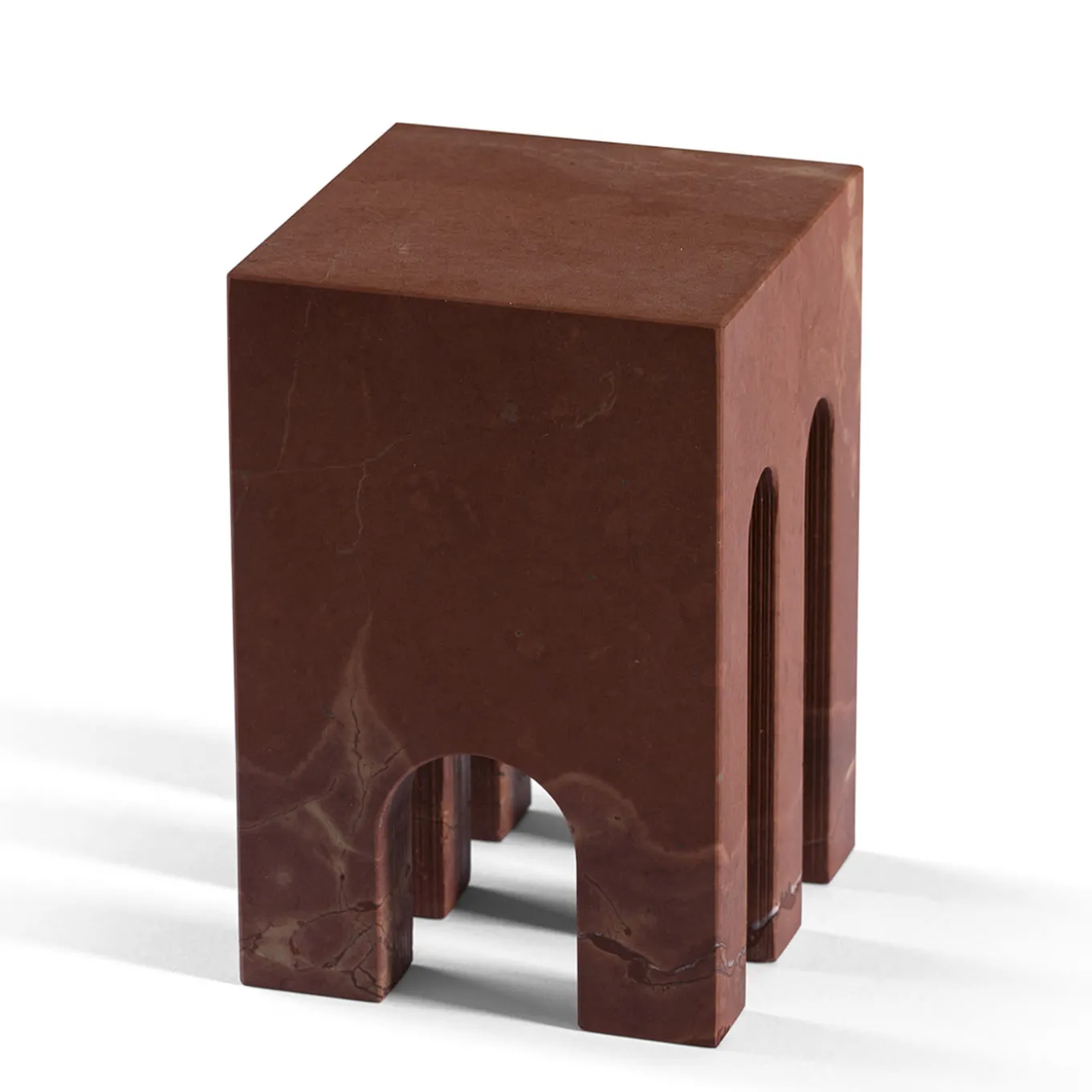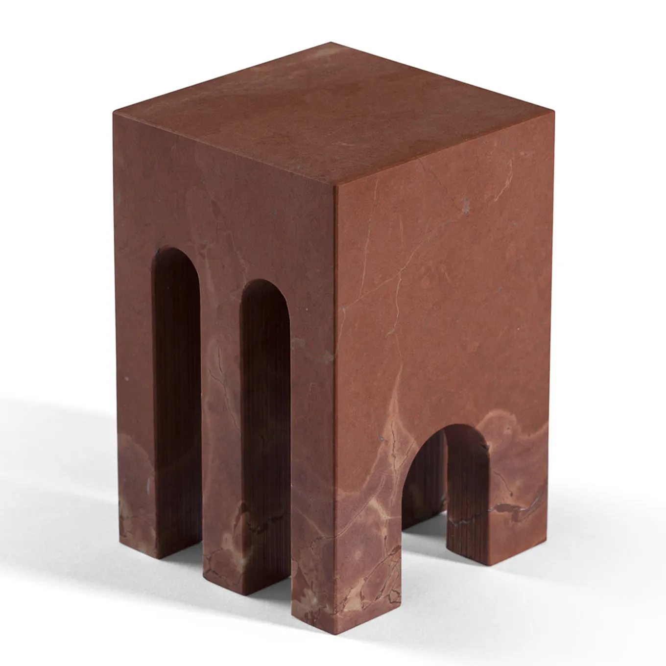 Part of The Village Collection, this fine sculpture in Rosso Collemandina shares with the different pieces from the same series a more intimate concept of home, arising during the pandemic as a consequence of the lockdown when “home” became a place to find shelter. Arches are cut out from the parallelepiped-shaped silhouette, a welcoming way to soften its structural rigor of high decorative appeal. Different marble variants are available.