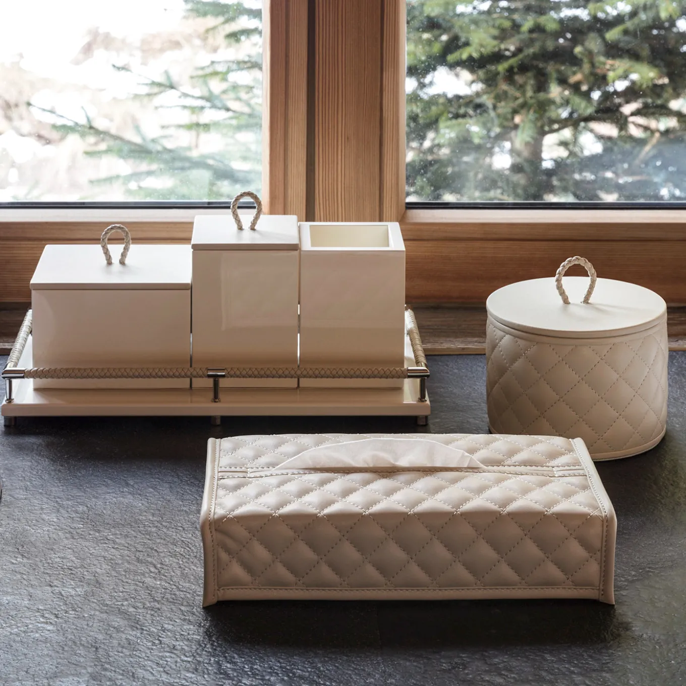 The Thea lacquer trinket box features a squared, elongated silhouette with a luminous lacquer finish complemented by a finely crafted leather lid with braided loop handle. Its elevated height suits storage of taller accessories or keepsakes, while the clean geometry adds a touch of architectural elegance to any space. Ideal for organizing treasured items, it balances subtle luxury with practical utility.