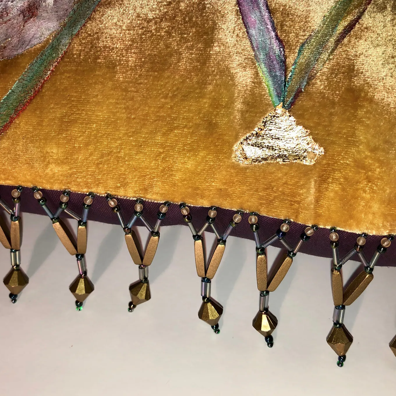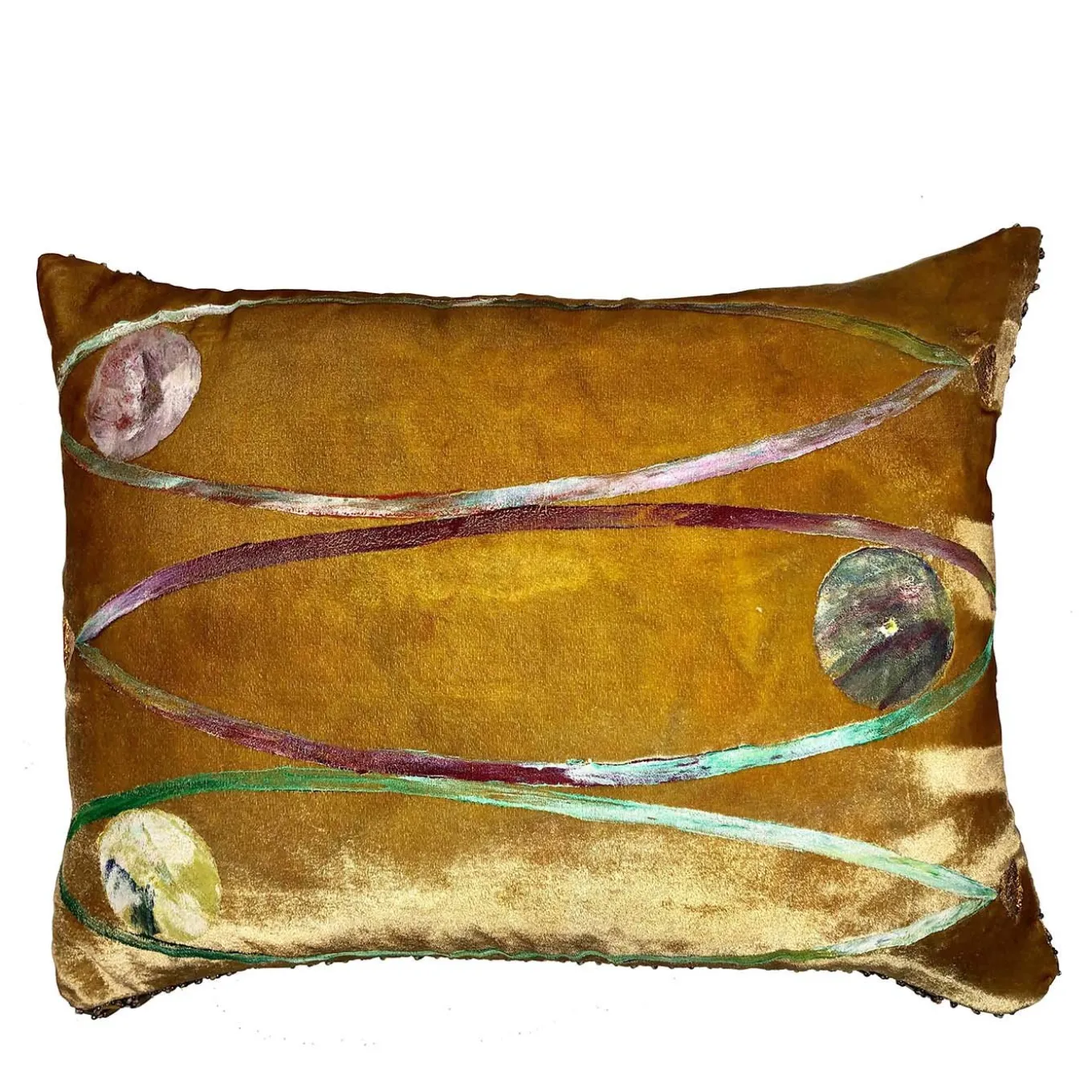 This spectacular cushion features a stunning design of three abstract fish and a trimming in glass beads. Delightfully artistic and beautifully luxurious, the silk velvet Three Fishes Cushion is dyed with yellow, gold and beige colors and hand painted with colored paste and gold leaf details. The back is in elegant purple silk.