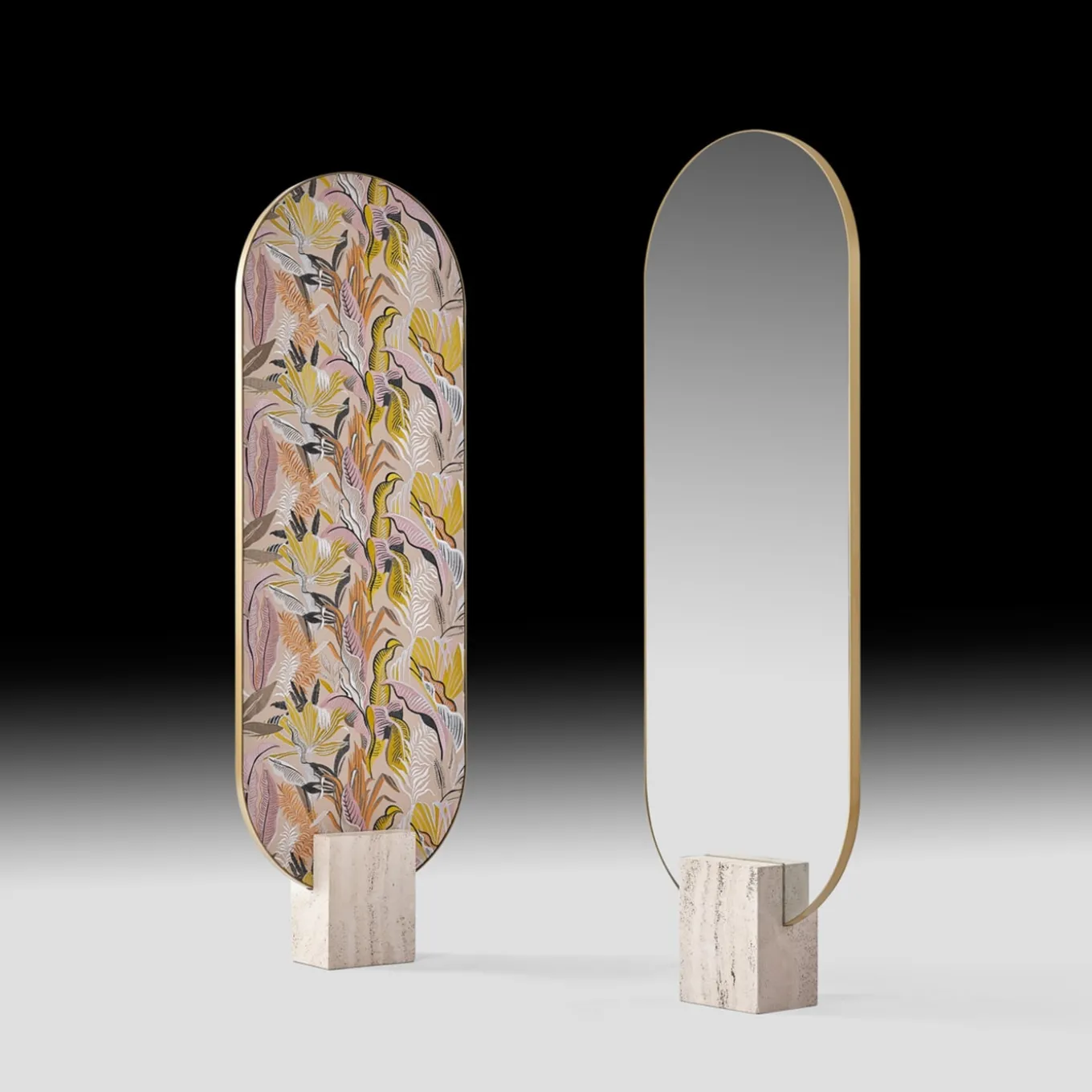 Minimalist volumes and precious sartorial details combine to lend this modern freestanding mirror its glamorous allure. Fitted to a bold open-pore Travertine block serving as a sculptural base, the extra-clear mirrored glass—defined by rounded extremities—is set in a matte golden metal frame, which is coupled to a thin plywood panel for a perfect synthesis of stability and lightness. Please explore available variants with the Concierge.