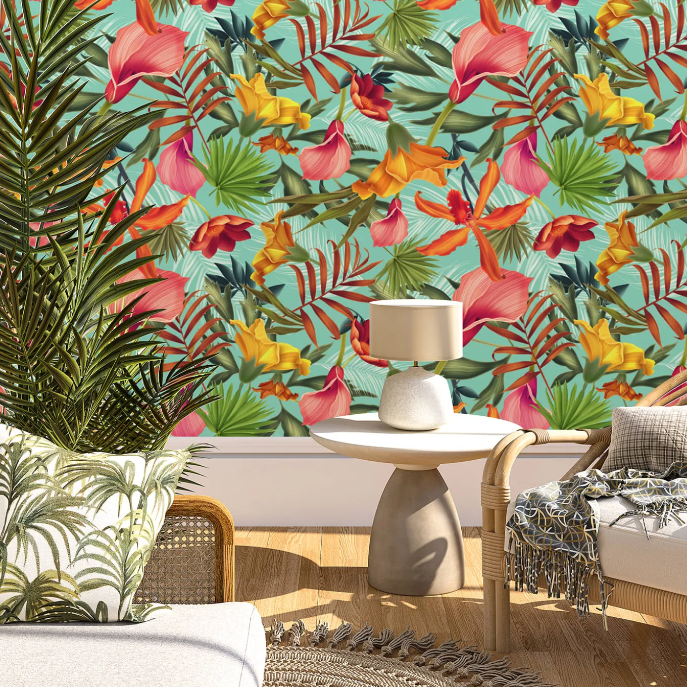 Ecological wallpaper, crafted from vegan water-based inks, designed and printed in Italy using the most advanced technologies. Versatile for walls, shelves, and furniture, it elevates any space. This print evokes distant Hawaiian sensations, transporting you to another dimension. With bright colors and meticulous detail, it adds a Boho twist to living room decor in a perfect match with wood, and ceramics. Instructions are included. The price refers to one package containing 8 sheets of premium wallpaper. Each sheet measures 27.5 x 39.4 inches (70 x 100 cm), for a total coverage of 59.2 sq. ft. (5 mq).
