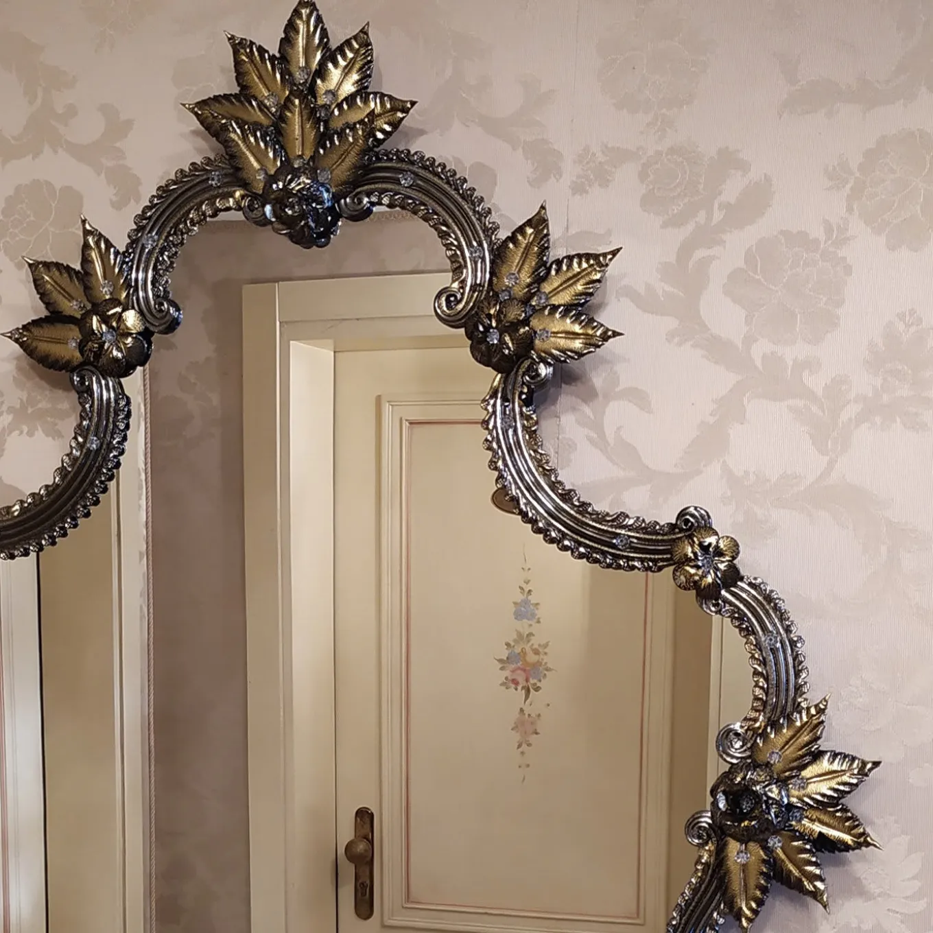 Exuding an opulent and dramatic allure, this wall mirror will make a singular and refined addition to an eclectic modern interior. A superb embodiment of the Venetian style and the valuable, long-lasting tradition of glassmaking, it is handmade of Murano glass with a stunning frame decorated with black and gold ornaments.