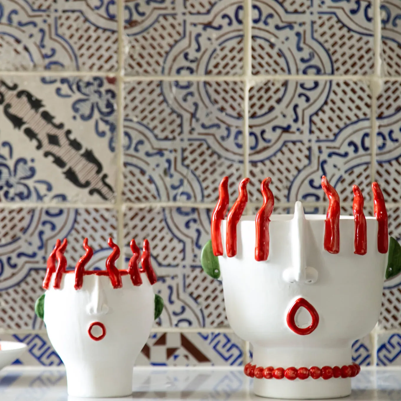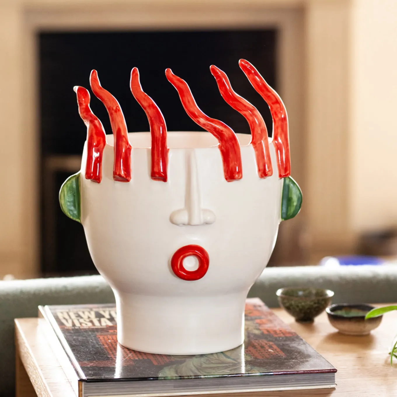 This sculptural vase results from the fresh and visionary approach of ceramist Patrizia Italiano. Part of a series dedicated to Sicilian street vendors, this anthropomorphic piece in matt white ceramic was inspired by Totuccio – a male vendor of peppers – and can be displayed alongside its female counterpart for a cohesive statement. The ears are accented in green, while the lips and the crown of peppers are painted in vibrant red and finished with crystalline for a glossy look.
