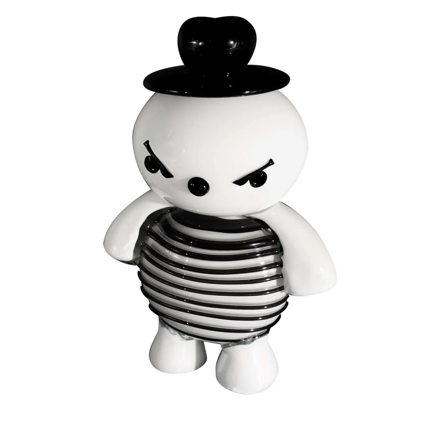 Merging sculpture and design, this handmade Murano glass sculpture will be cherished throughout the years. The charming figurine designed by Antonio D’Amato has an opaque white body with black accents, namely a small top hat and a series of black horizontal stripes for clothes. Reminiscent of the characters from 1920s silent movies and early cartoons, this figurine has a stern countenance marked by the bold, angled eyes. Entirely customizable, this piece will be a lovely gift for a loved one on a special occasion.