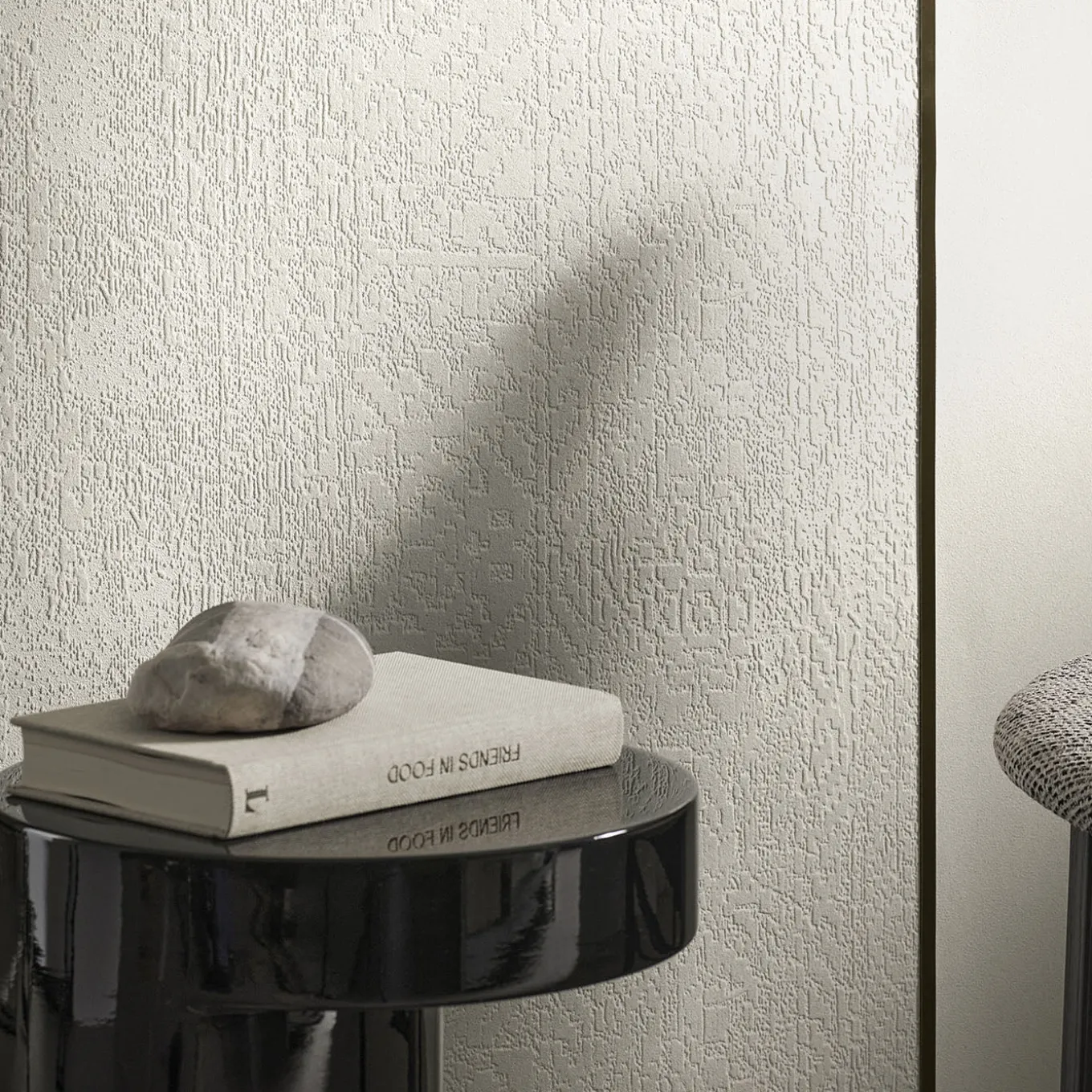 The Tracce wallpaper, from the Tramae Collection, features a subtle pattern inspired by hand-knotted carpets, blending traditional motifs with a contemporary touch. Its design reveals delicate, imperfect details that emerge up close, while maintaining a uniform appearance from a distance. The wallpaper creates a dynamic interplay of light and texture, offering a refined surface that adds depth and movement to interior spaces without overwhelming them.