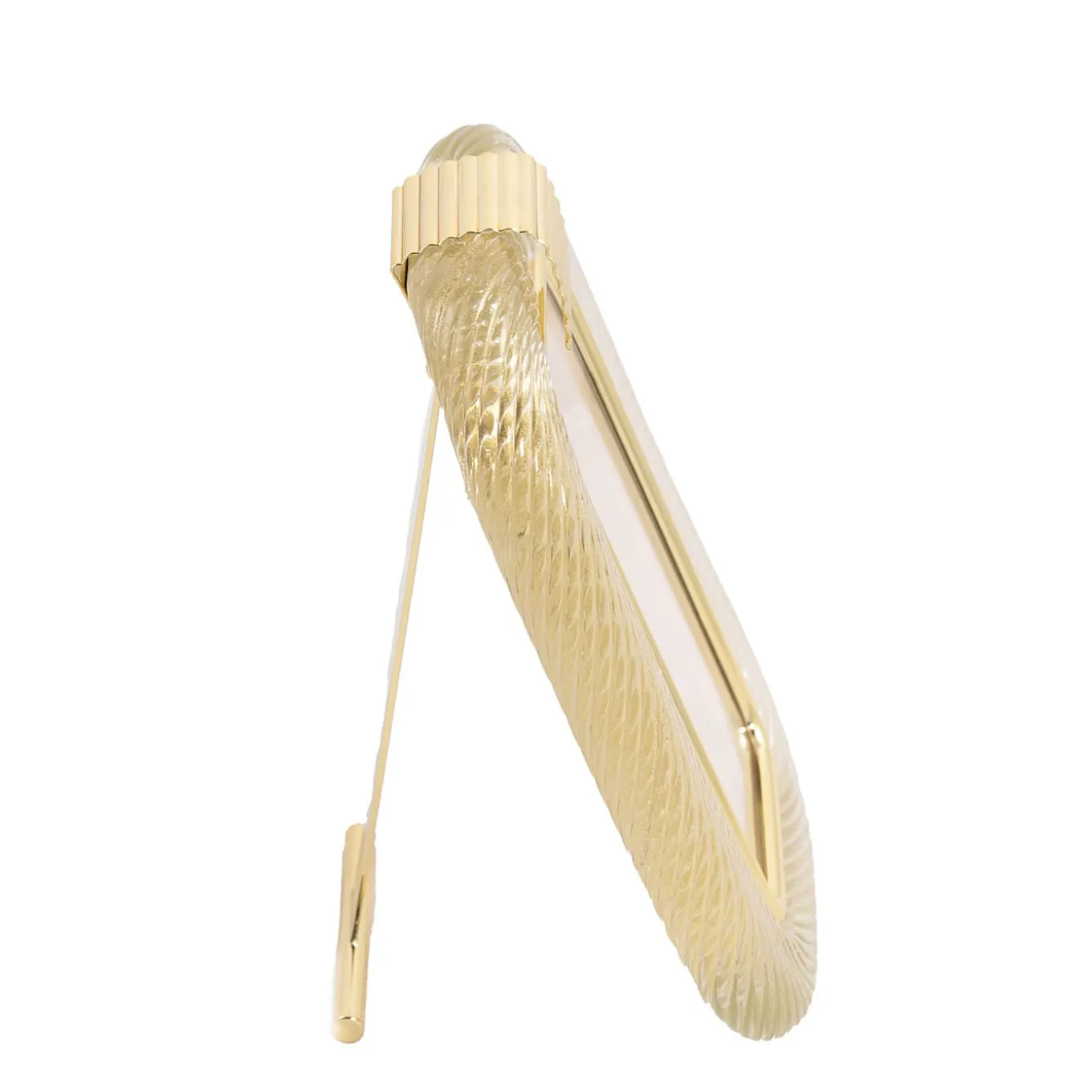 This frame is handcrafted in a historic Venetian glassworks using the traditional blown-glass twisting technique, adorned with 24 kt gold leaf that infuses the glass with a warm, lustrous glow. The hand-shaped brass structure features a glossy finish, with matte brass available upon request. Additional color variations are offered in the Artemest catalog. A larger size is available upon request; please contact the Concierge for more information.