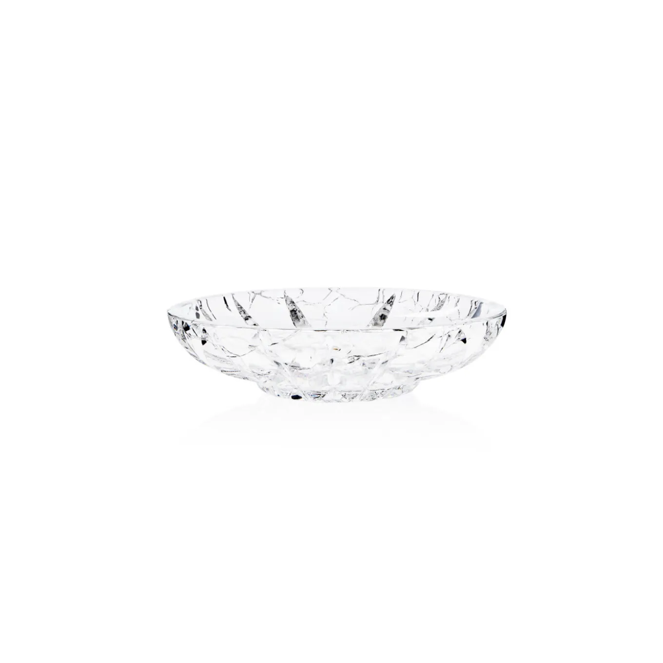 This elegant set, part of the Trickerey collection, is an ideal addition to a modern powder room or bathroom. The pieces were crafted of transparent glass with a striking texture obtained by combining an irregular net of crackles running over a series of parallel, curving grooves. The resulting sense of movement is sophisticated and timeless. The two pieces are: a soap dish (Ø 15cm), and a soap holder with metal dispenser (Ø 7.8cm and H 20.5cm).