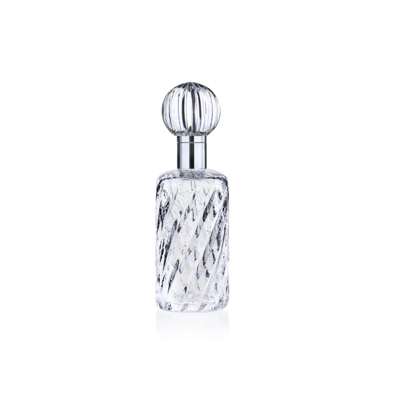 Part of the Trickerey collection, this set comprises a toothbrush holder and a perfume bottle. Elegant and versatile, these pieces will be a precious addition to a sophisticated powder room or bedroom. They were crafted of transparent glass with a crackled texture running over a series of gently curved parallel grooves. The toothbrush holder measures Ø 7.8cm and H 12cm, while the perfume bottle, with its spherical stopper, is Ø 7.8cm and H 23.5 cm.