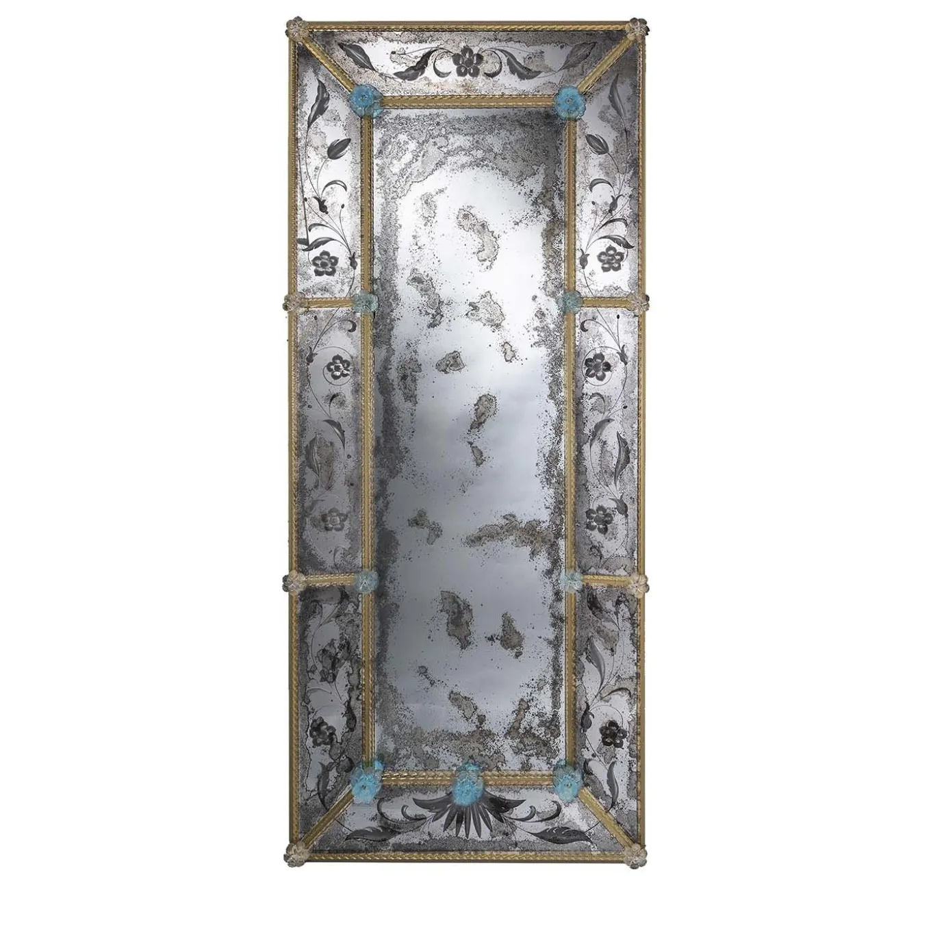 This long, rectangular Venetian glass wall mirror has a whimsical look. Hand-engraved on a sandstone wheel, this piece underwent a special process to give it its antique appearance. A delicate outer and inner frame is crafted from amber Murano glass, complemented by flower and rose decorations in gold and aquamarine. The mirror is meticulously silvered by hand using a special antiquing technique and adorned with torchon rods, Murano glass flowers, and rosettes in amber, crystal with gold leaf, and aquamarine.